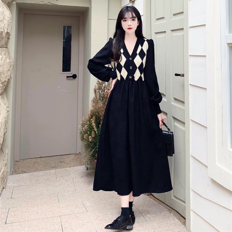 大人可愛いダイヤ柄のドッキングニットワンピース。