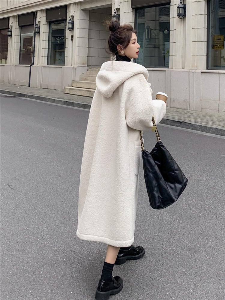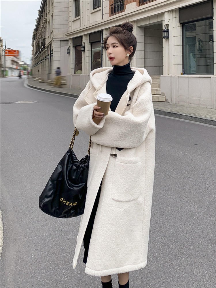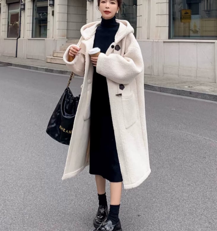 大人可愛いフード付きのダッフルボアコート。