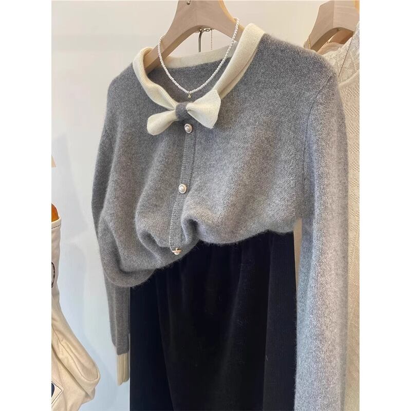 バイカラーのリボンが大人可愛い薄手素材のカーディガン。