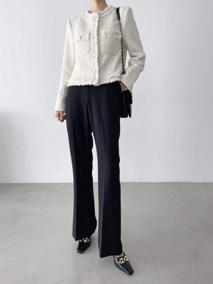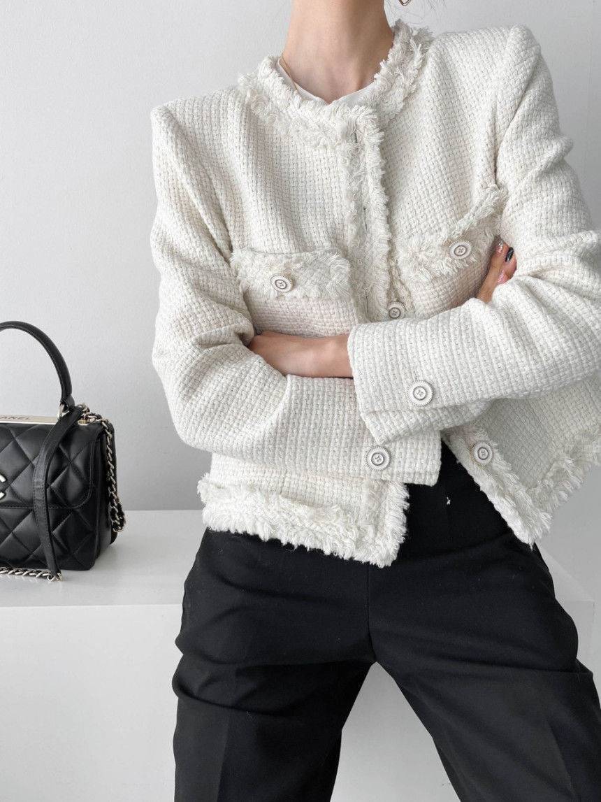さりげないフリンジが大人エレガントなツイードジャケット。
