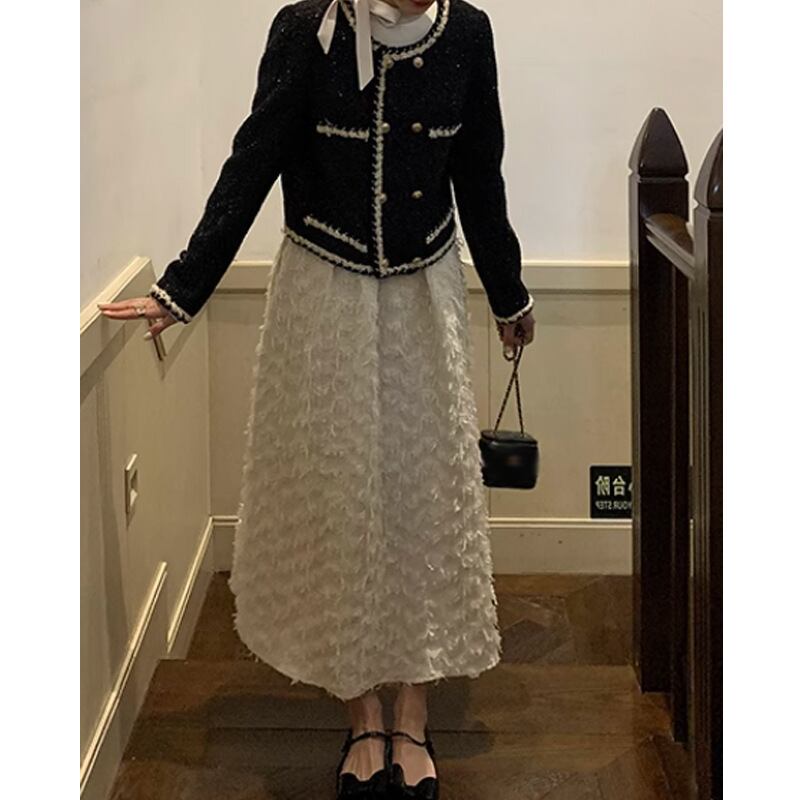 大人可愛いフリンジジャガードパーティードレス。