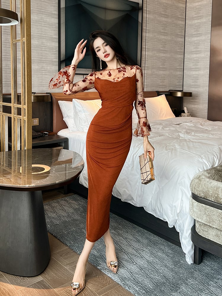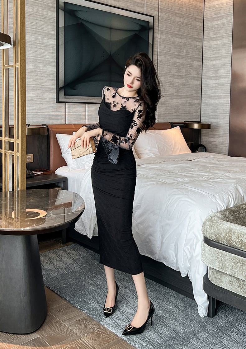 お袖の透け感がドレッシーなタイトワンピースドレス。