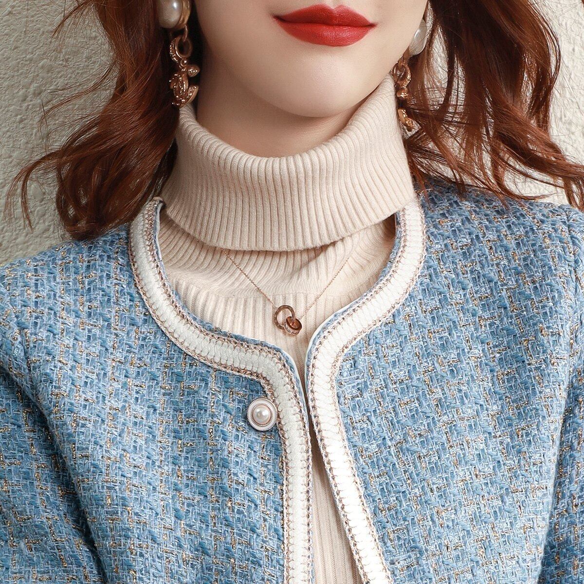 おしゃれ度高めなパイピングとパールボタンが今年らしく女性らしい。