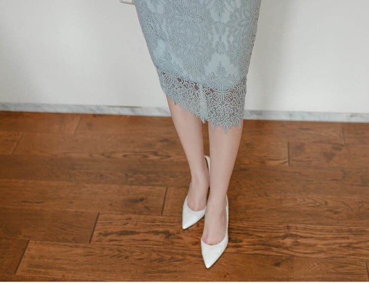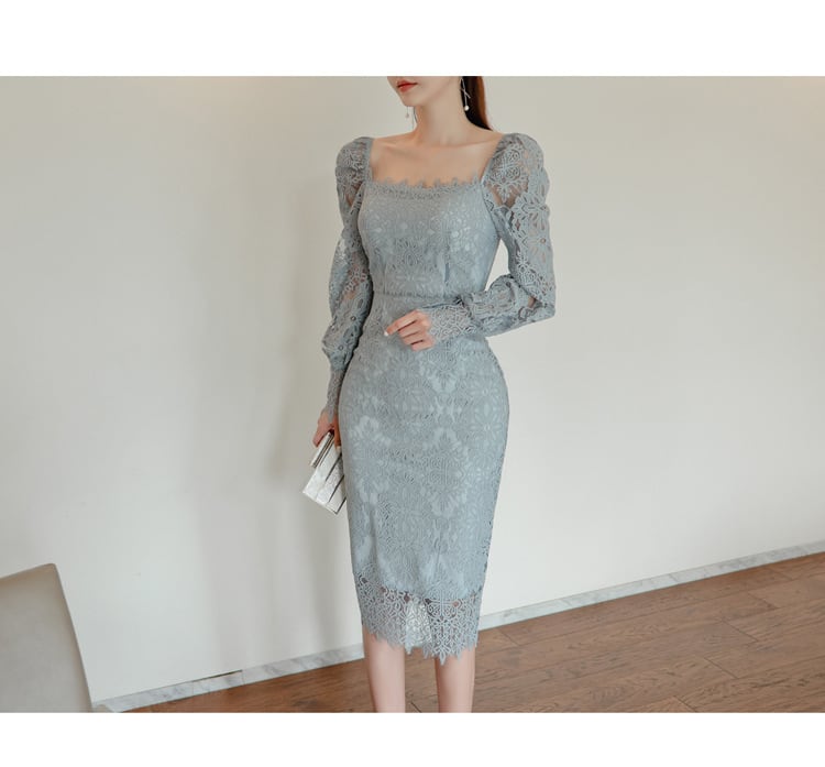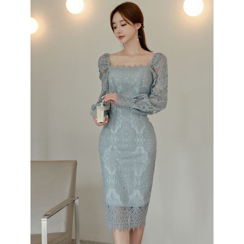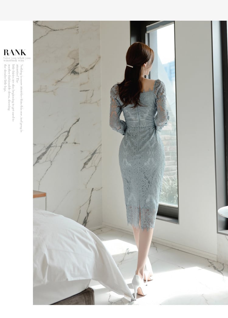大人エレガントな総レースのミディ丈ワンピースドレス。
