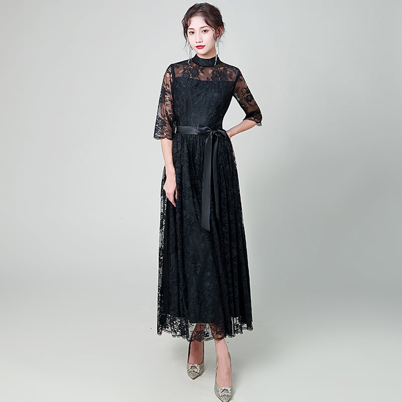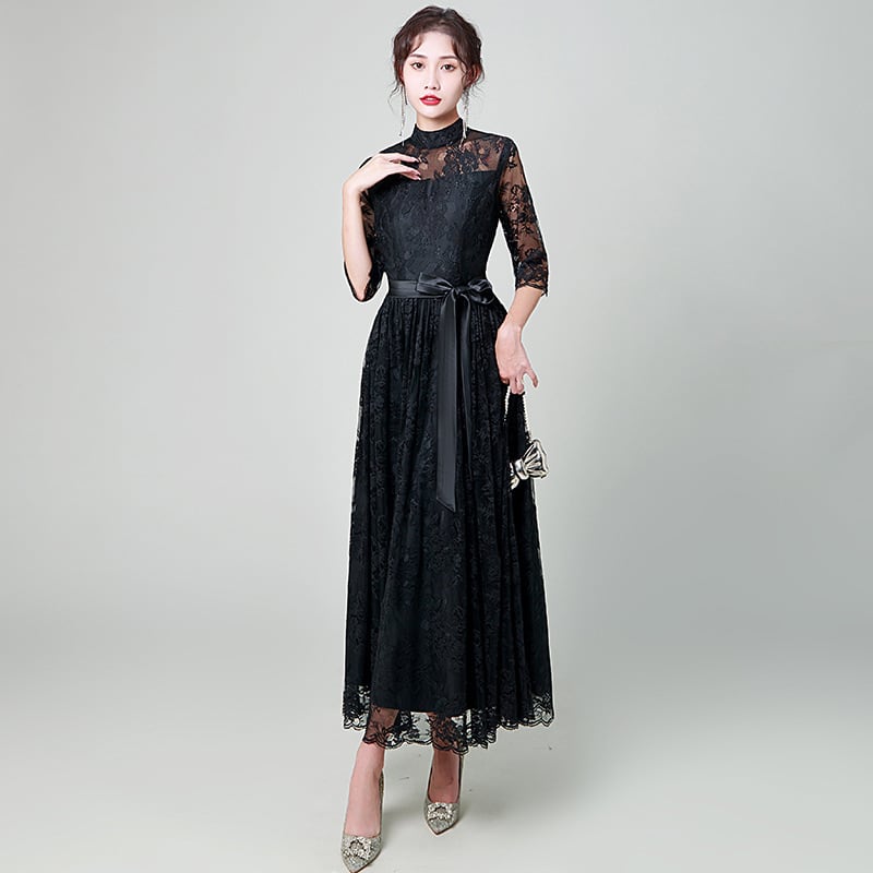 大人エレガントなハイネックの総レースパーティードレス。