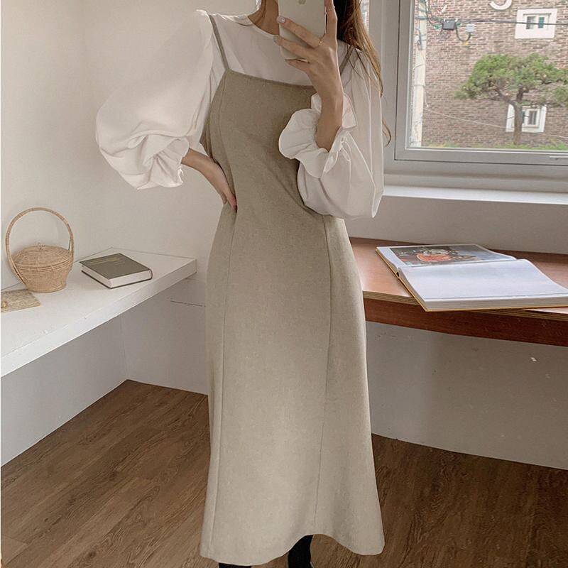 大人可愛いブラウス+ストラップワンピースのセットアップ。