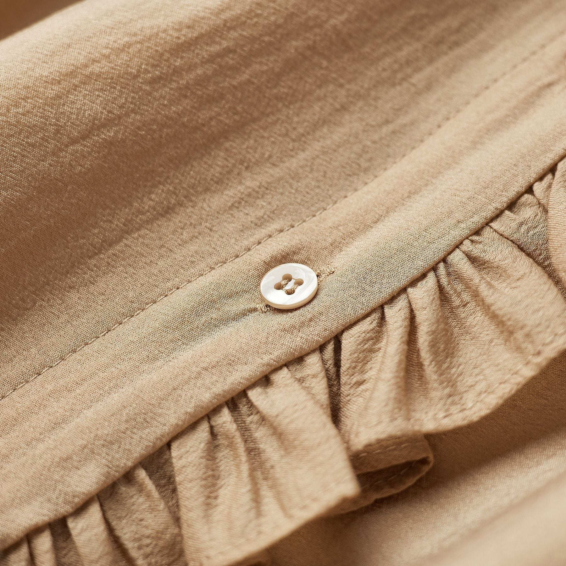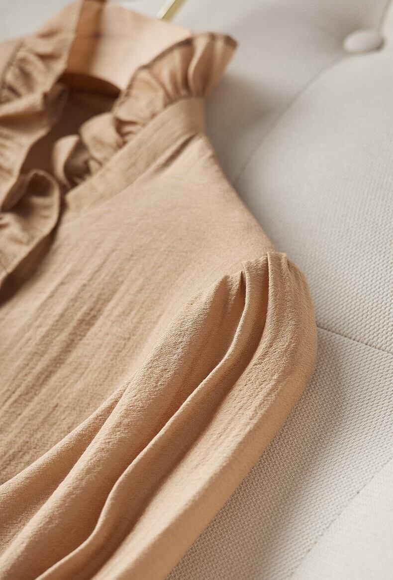 ツヤと光沢感あるエレガントなフリルハイネックブラウス。