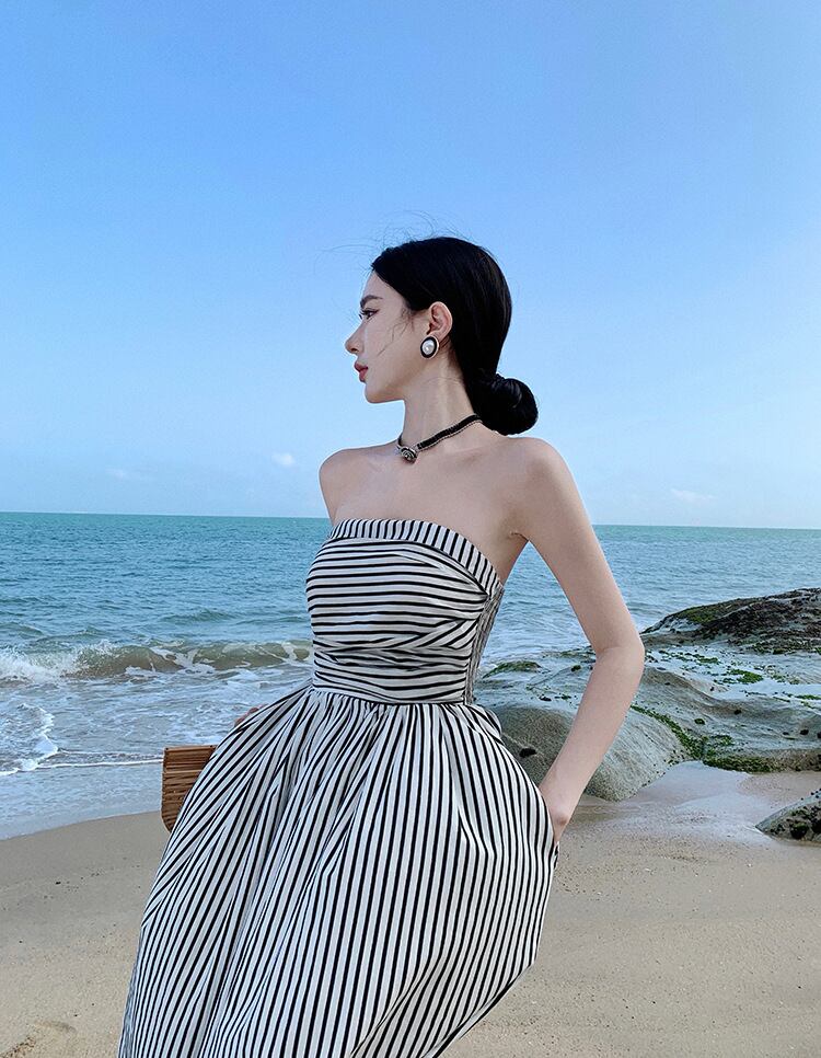 大人可愛いベアトップのストライプ柄ワンピース。