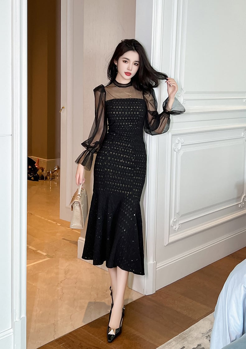 【パーティードレス】 パーティードレス 結婚式 お呼ばれドレス 結婚式のお呼ばれ ドレス 黒 20代 30代 40代 ワンピース 袖あり ミモレ丈 シースルー 体型カバー フォーマルドレス 結婚式フォーマル お呼ばれ ワンピース ロングワンピース 二次会 フォーマルワンピース おしゃれ シンプル ブラック 黒 S M L