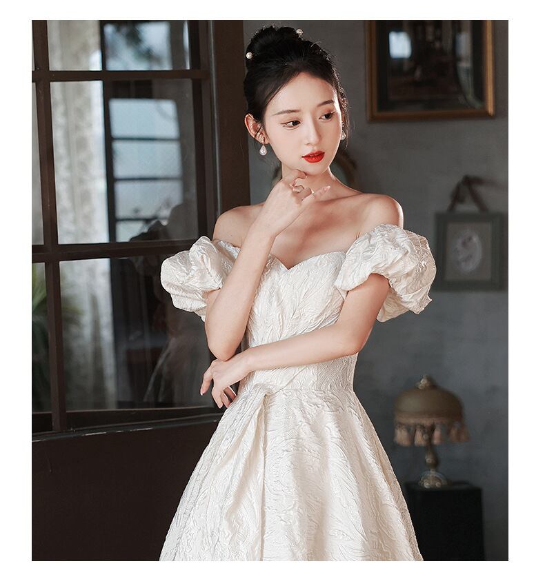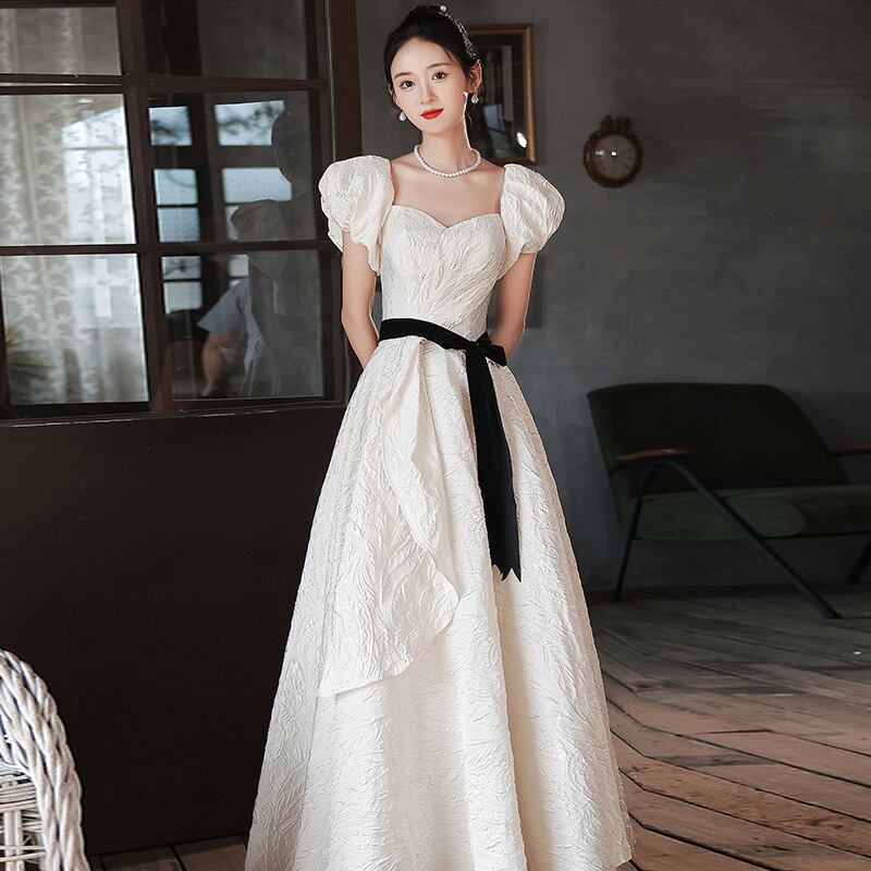 パフスリーブとウエストのリボンが大人可愛いウェディングドレス。