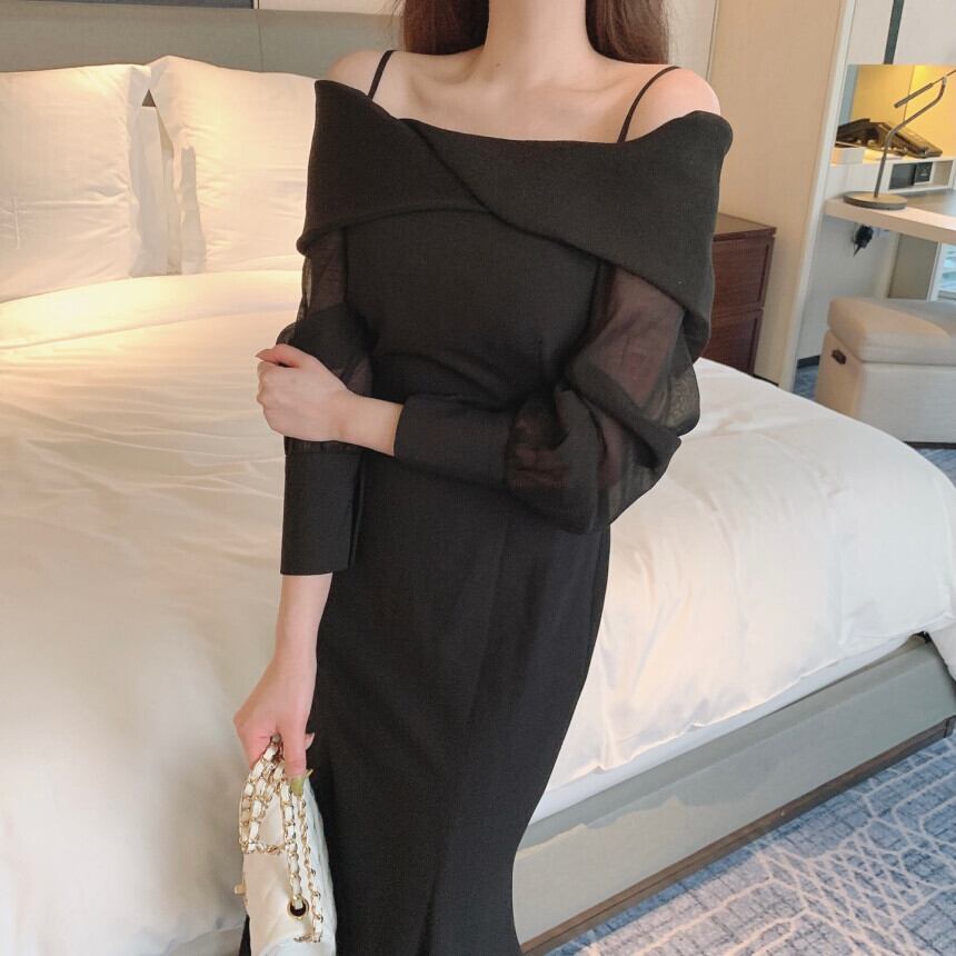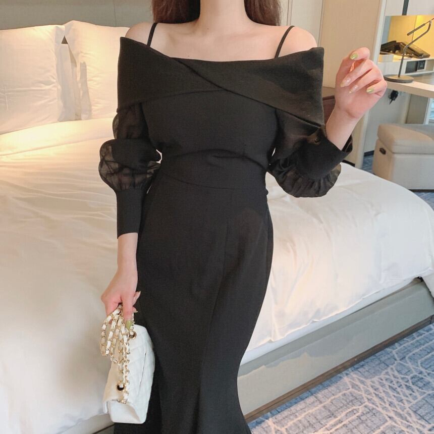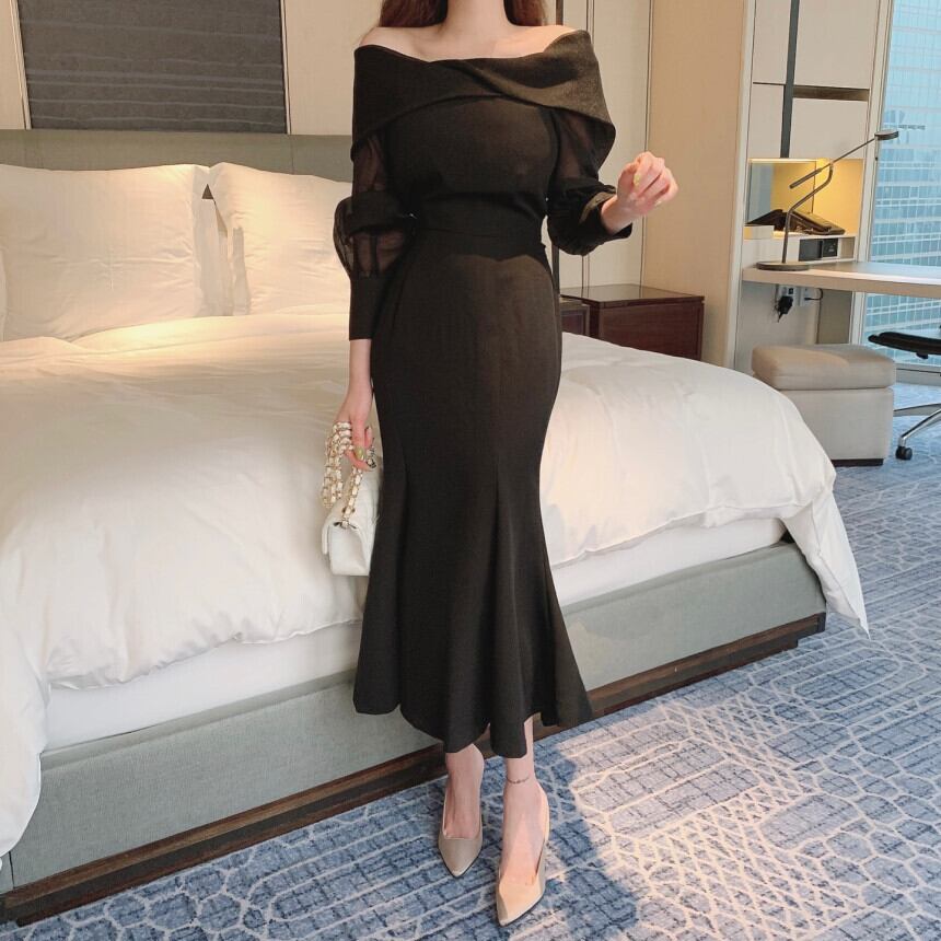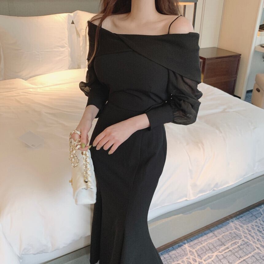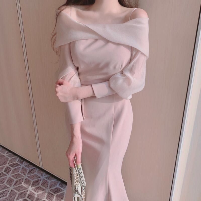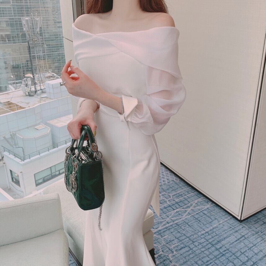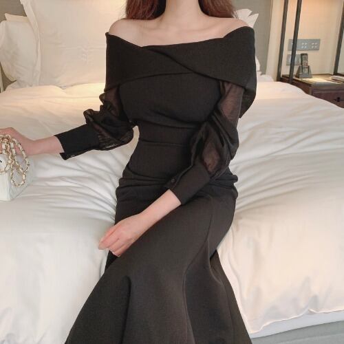 大人可愛いオフショルダーマーメイドワンピースドレス。