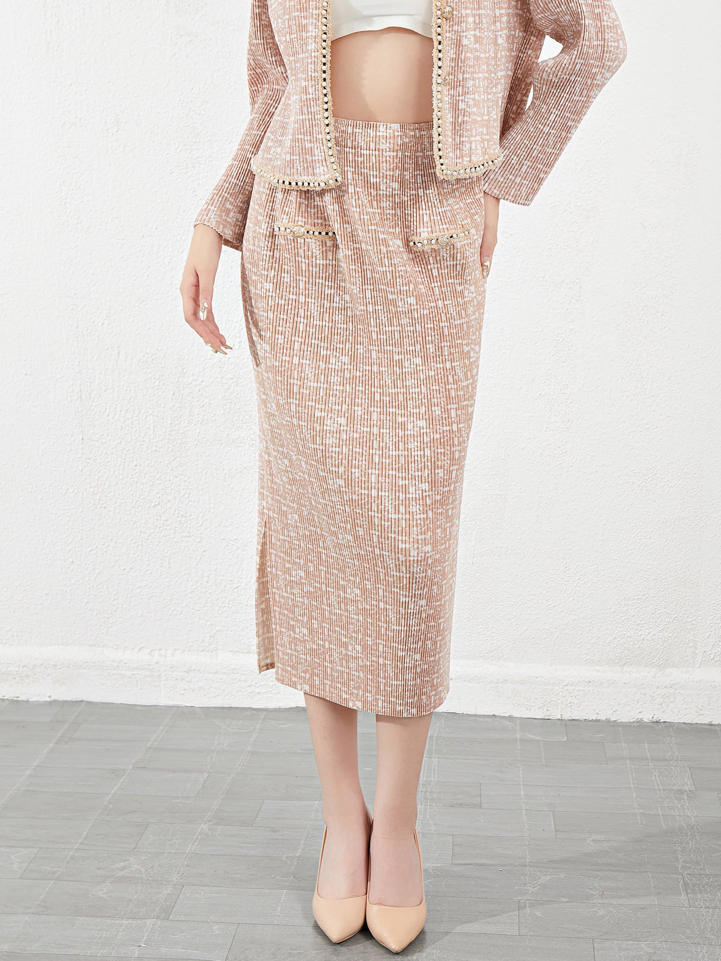 ジャケット+スカートでそれぞれ単品でも着用いただけるのもうれしい。