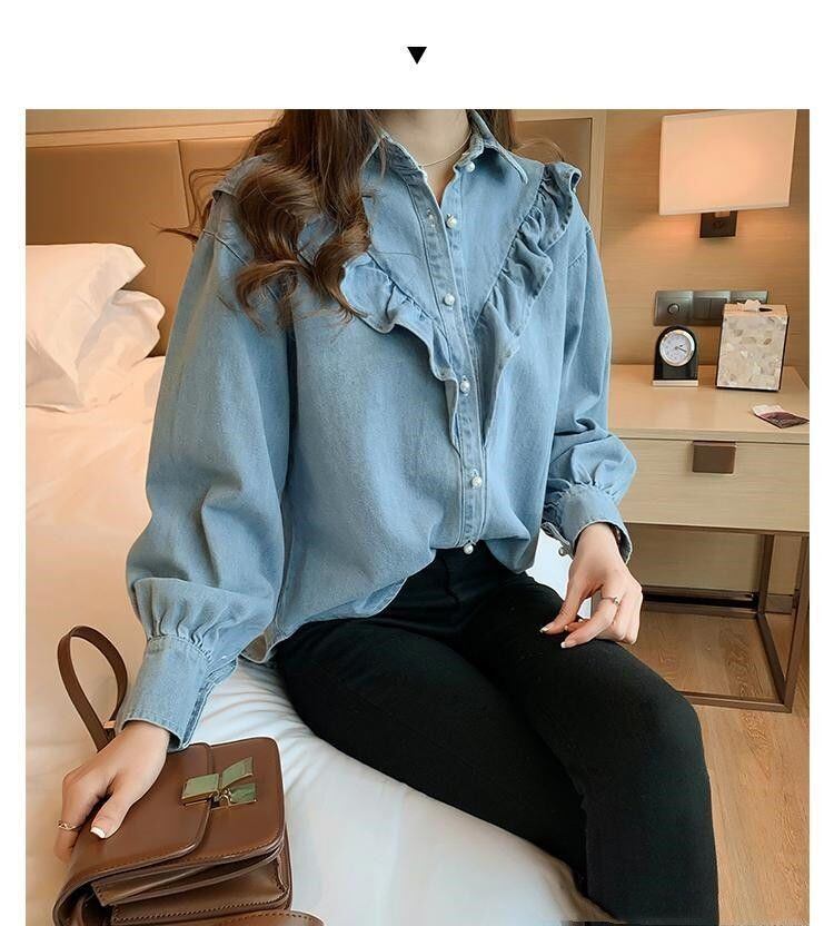 パールボタンとフリルが大人可愛いデニムシャツ。