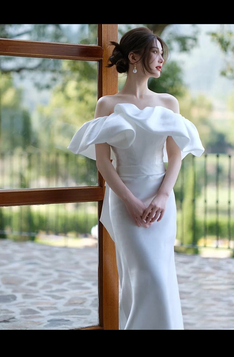 体のラインに沿った細身のシルエットで花嫁様のスタイルを引き立てる。