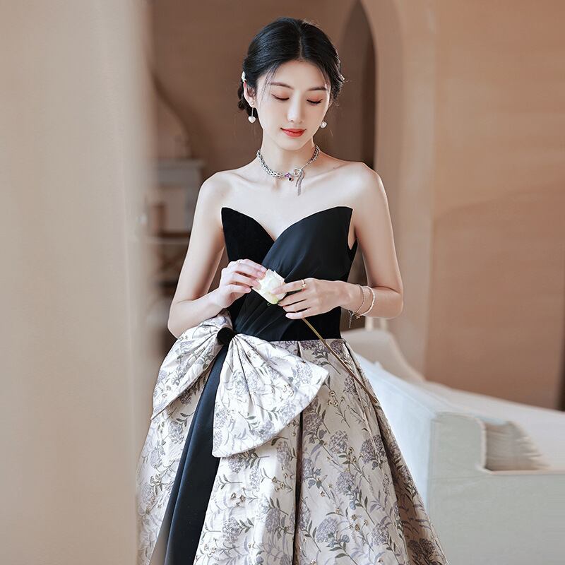 ウエストの大きなリボンが大人可愛いバイカラーのパーティードレス。