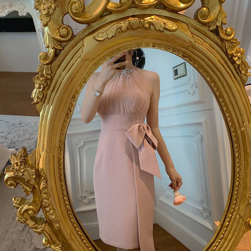 ちょっぴりセクシーなホルターネックのパーティードレス。