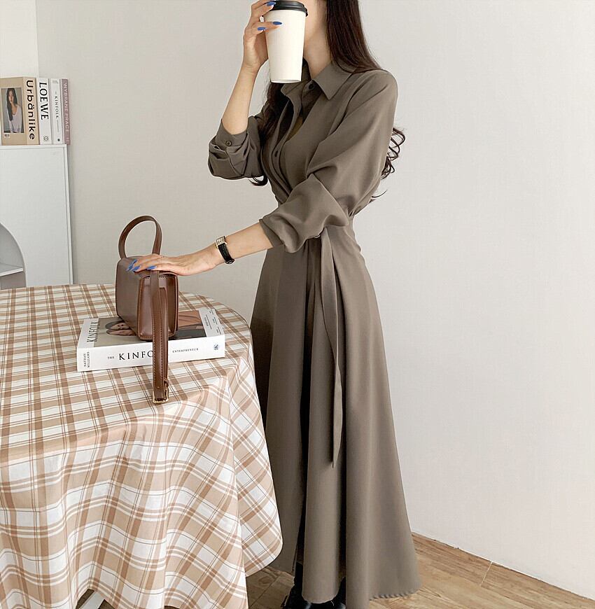 【ワンピース】ワンピース レディース 春 秋 冬 おしゃれ 20代 30代 40代 無地 ロングワンピース 長袖 シャツ ワンピース ロング 韓国 ワンピース ドレス ワンピース 大人 可愛い きれいめ ベージュ ブラック 黒 カーキ