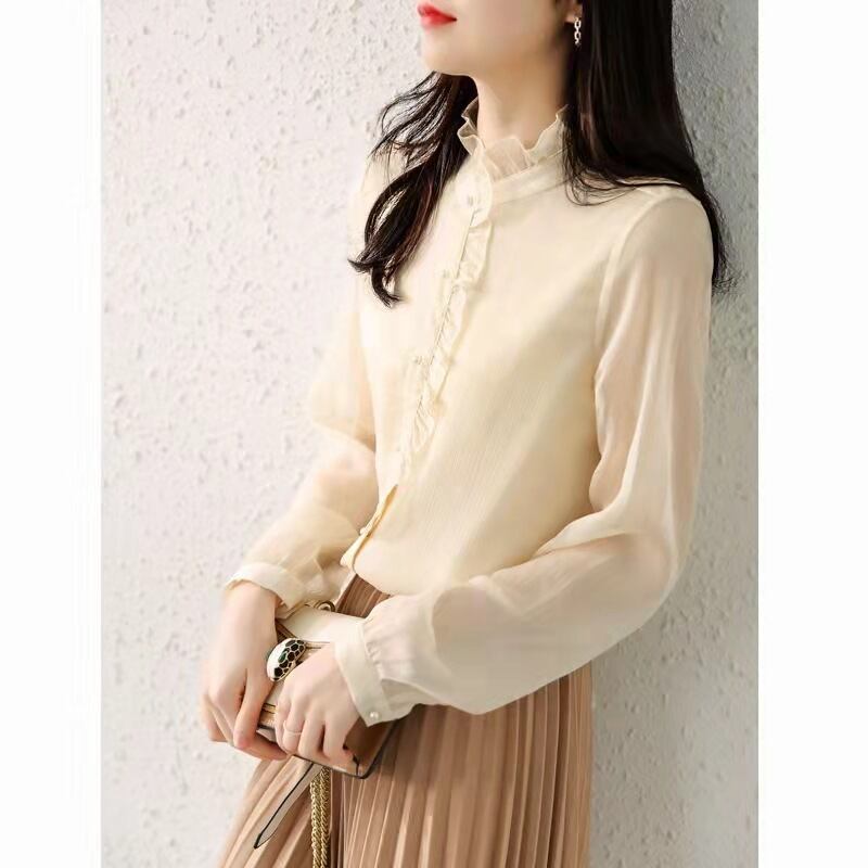 フリルが大人可愛いスタンドカラーのブラウス。
