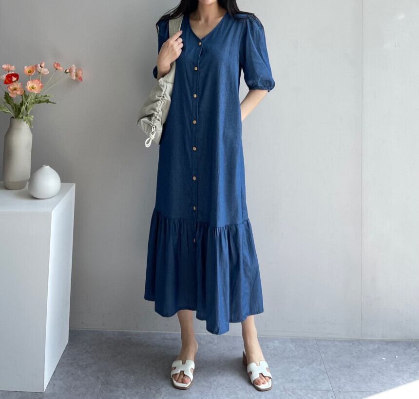 【ワンピース】ワンピース レディース 春 夏 秋 おしゃれ 20代 30代 40代 無地 ロングワンピース 春秋 半袖 五分袖 シャツ ワンピース ロング 韓国 ワンピース ドレス ワンピース 大人 可愛い カジュアル きれいめ ダークブルー ライトブルー 青 S M L XL