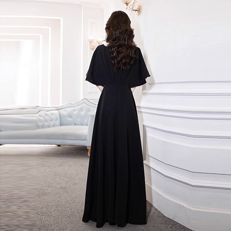 二の腕をスリムに見せるフレアスリーブとvネックがエレガントなパーティードレス。