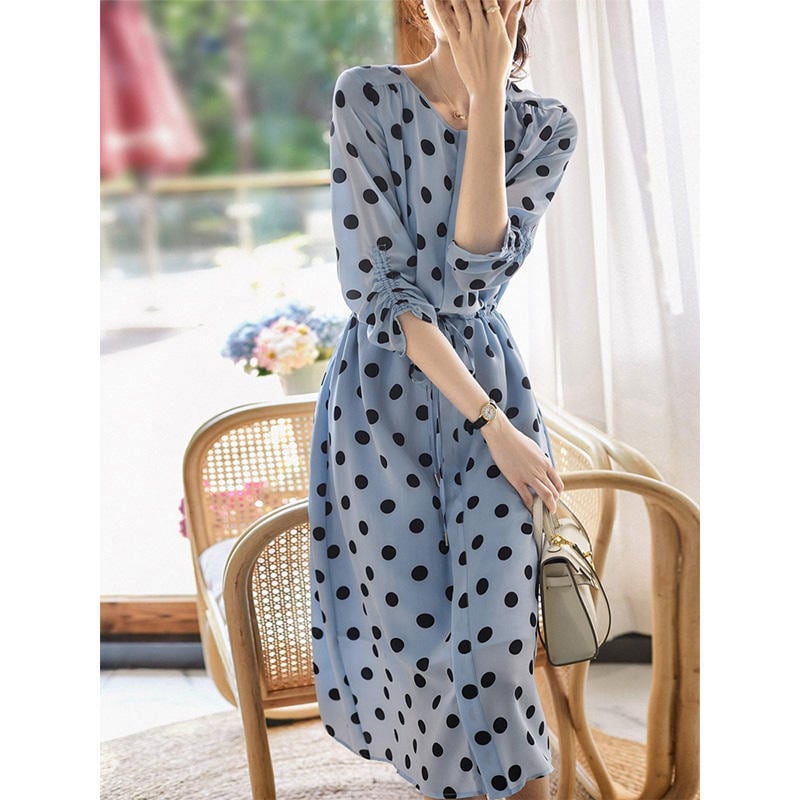 【ワンピース】ワンピース レディース 春 夏 秋 おしゃれ 20代 30代 40代 ドット ロングワンピース春秋 七分袖 シャツ ワンピース ミモレ丈 韓国 ワンピース ドレス ワンピース 大人 可愛い カジュアル きれいめ レトロ ネイビー 青 S M L XL
