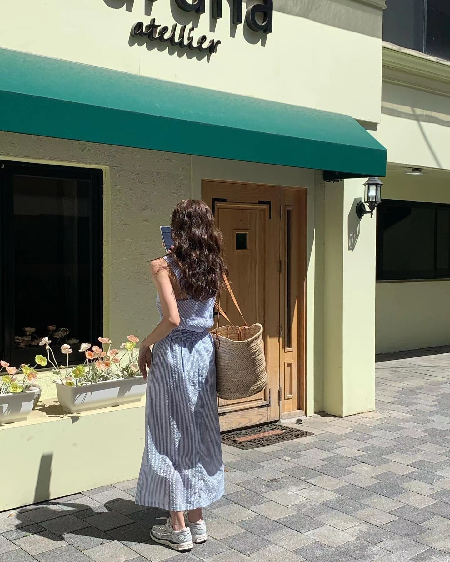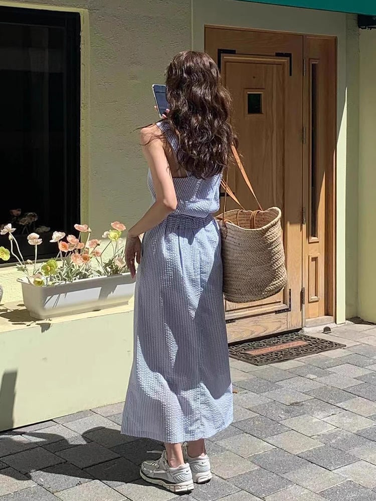 【セットアップ】 セットアップ レディース 春 夏 秋 ストライプ ノースリーブ トップス スカート ハイウエスト 20代 30代 40代 おしゃれ 海 ビーチ リゾート ネイビー 青 S M L