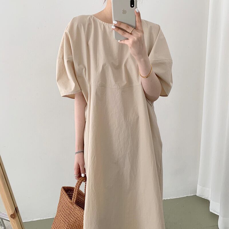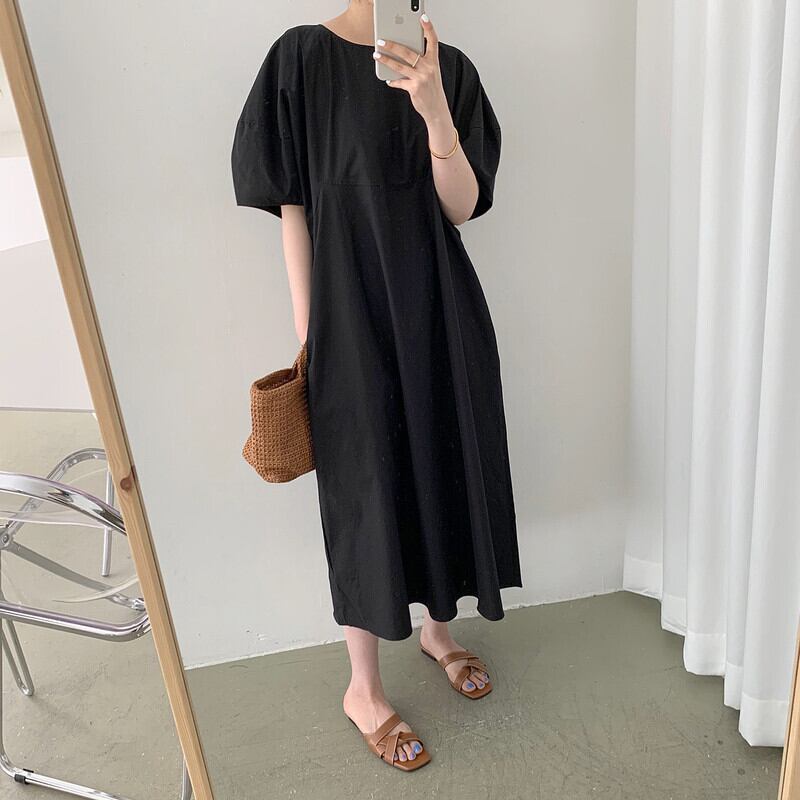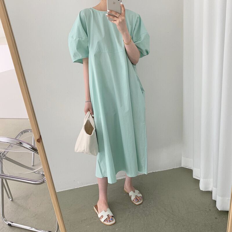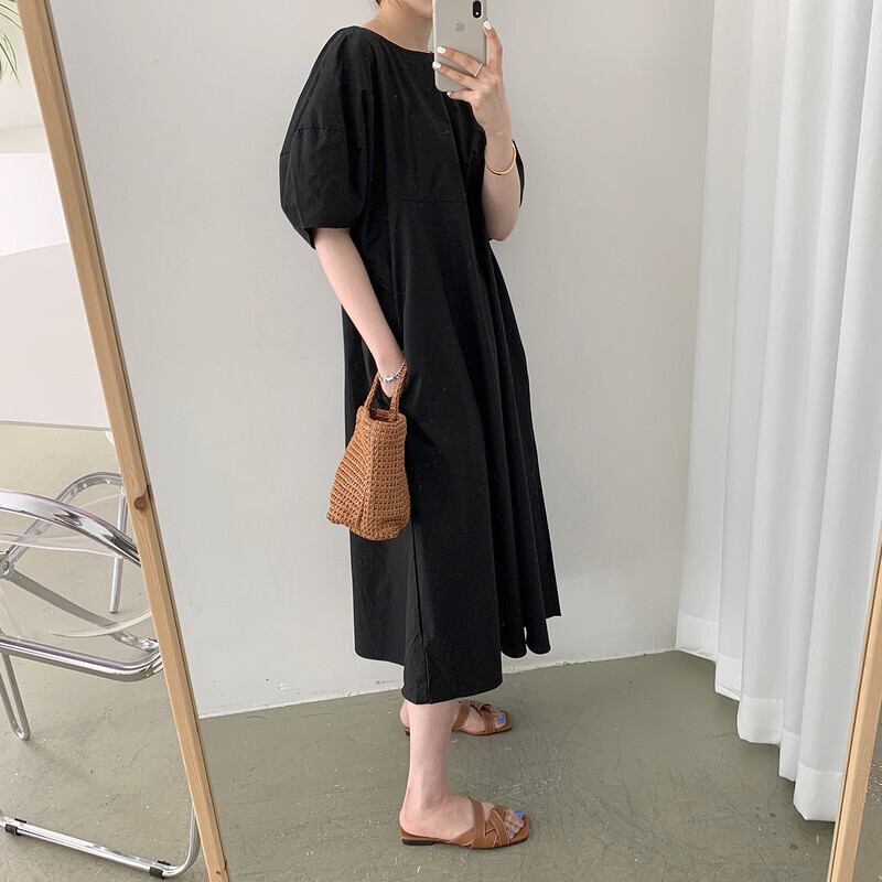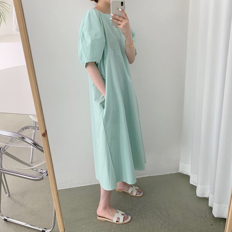 身幅のゆったりとしたパフスリーブドレスワンピース。