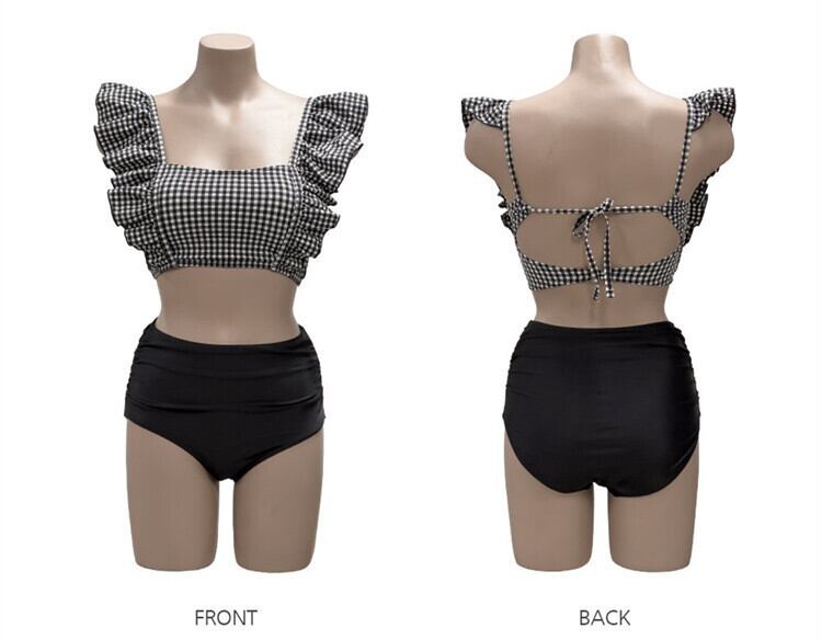 フリルがキュートで可愛らしいギンガムチェックのトップス+モノトーンカラーのビキニ。