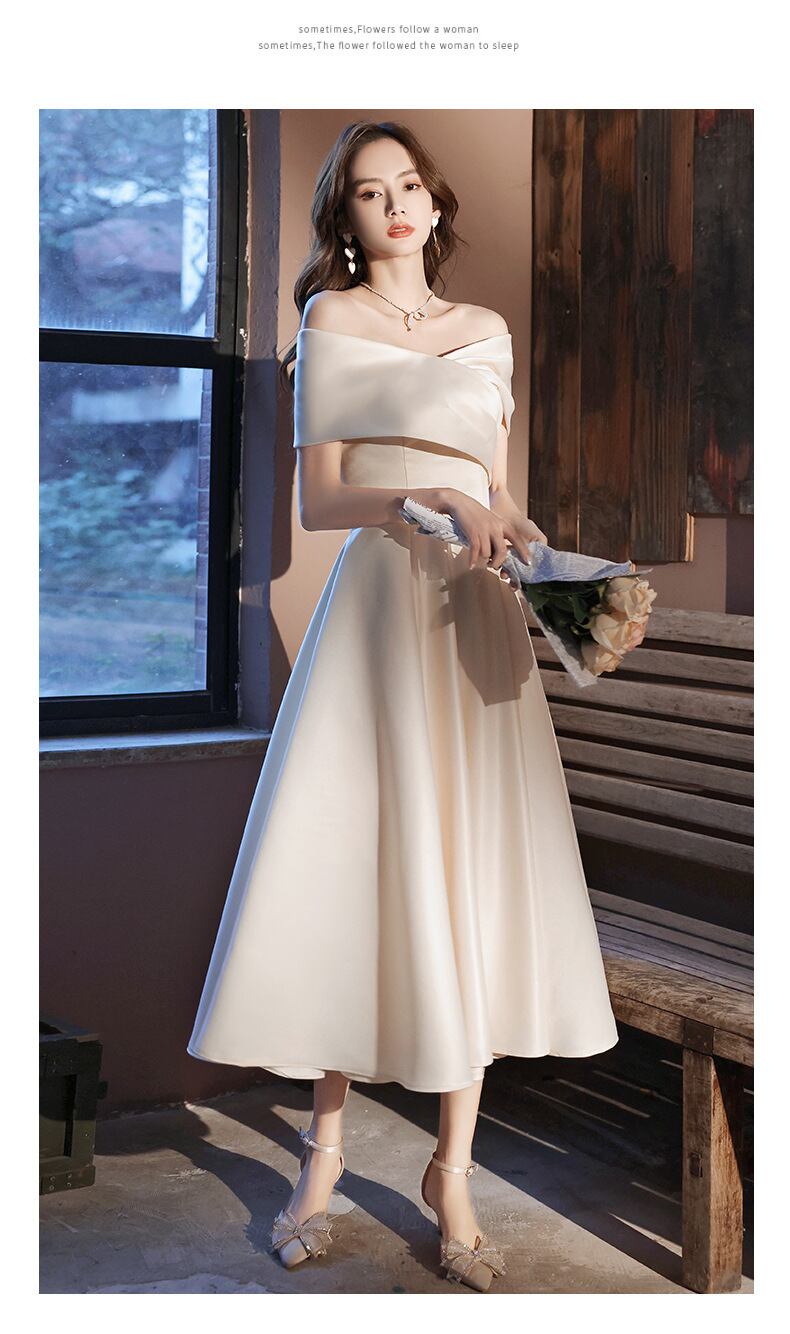 大人のエレガントさ引き立つオフショルダーのパーティードレス。