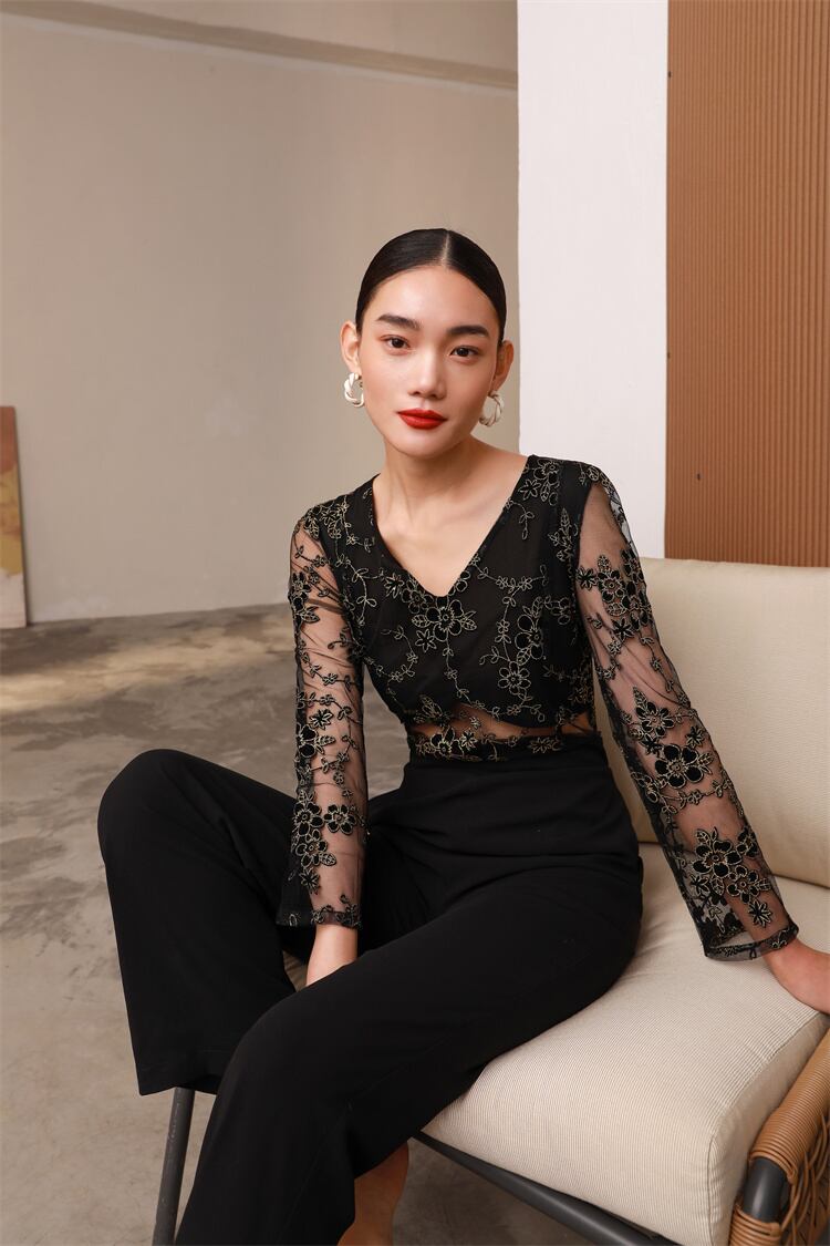 シアーな透け感と立体花刺繍がエレガントなパンツドレス。