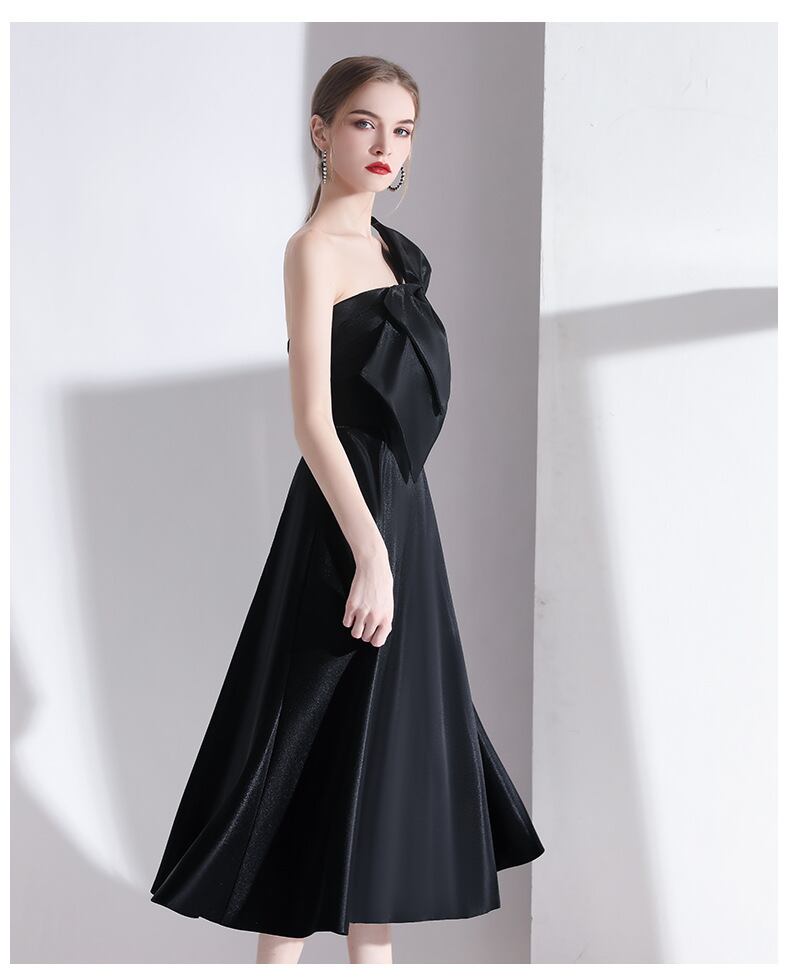 大きなリボンが印象的なワンショルダーのパーティードレス。