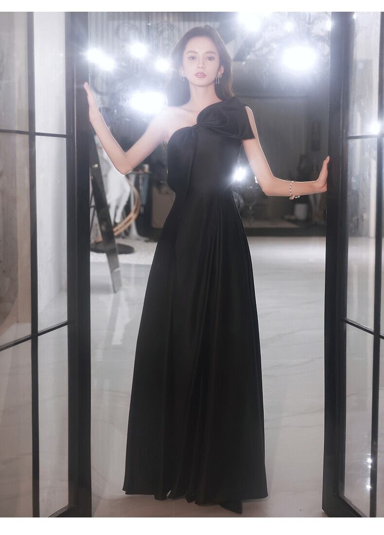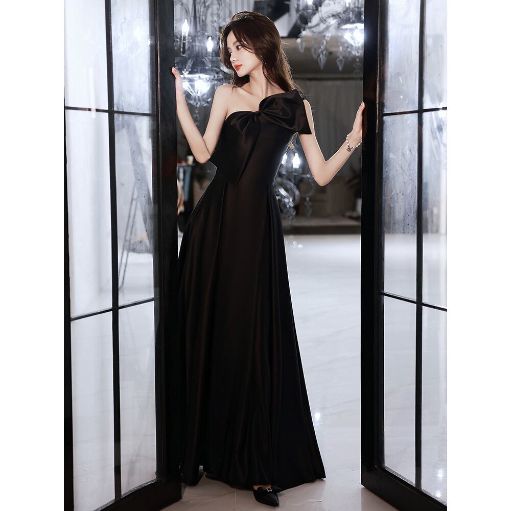 大きなリボンが印象的なワンショルダーのパーティードレス。