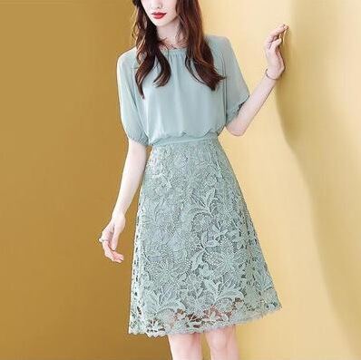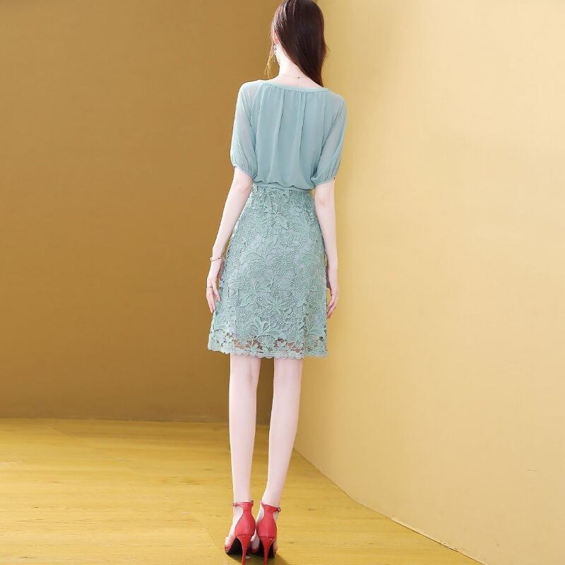 シフォンとレース切り替えの大人可愛いパーティードレス。