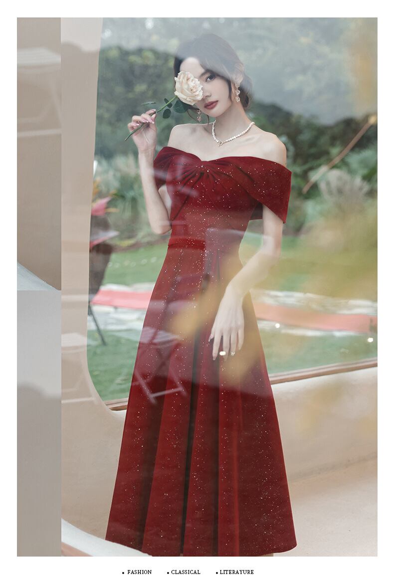 華やかなワインレッドがエレガントなオフショルダーのパーティードレス。