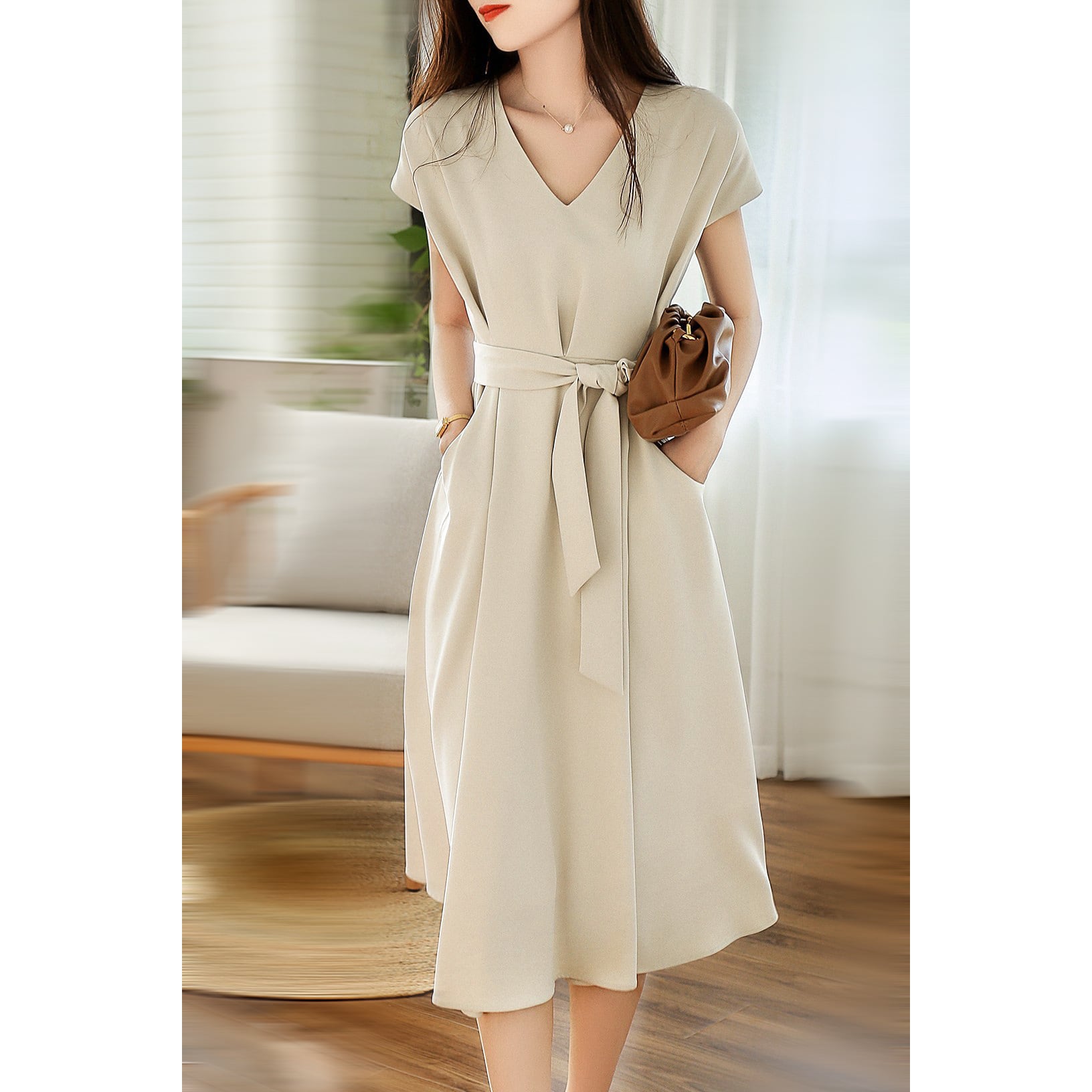 vネックで美しいデコルテラインをウエストのベルトでウエストの細見え効果も。