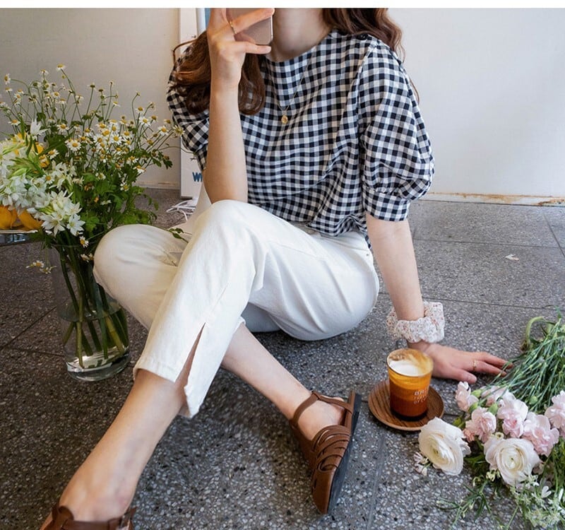 大人可愛いギンガムチェックのパフスリーブブラウス。