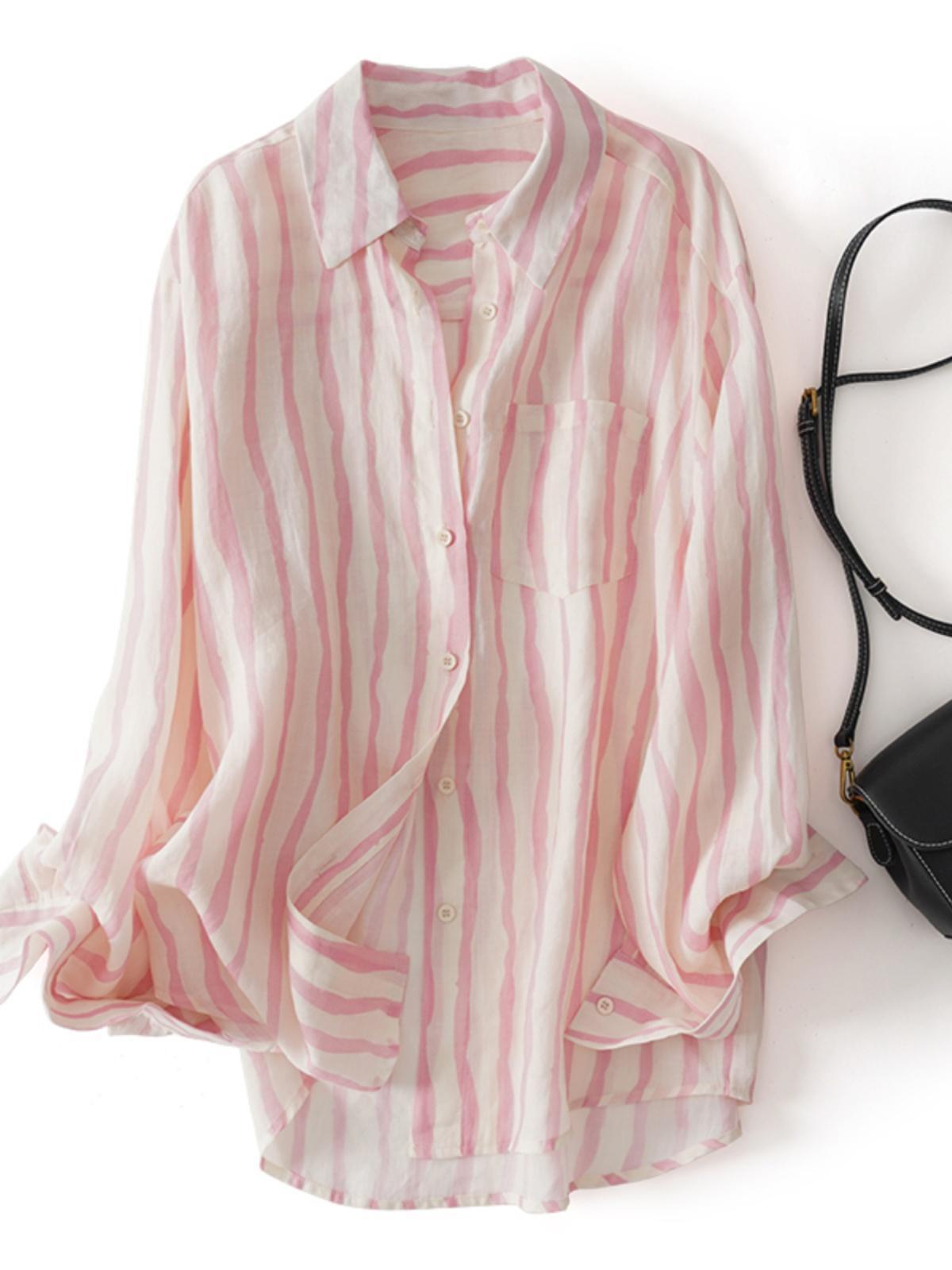 【シャツ】大きいサイズ シャツ レディース シャツブラウス ブラウス レディース ストライプ 長袖 20代 30代 40代 春 夏 秋 トップス カジュアル 可愛い きれいめ シンプル ピンク M L XL 2XL 3XL