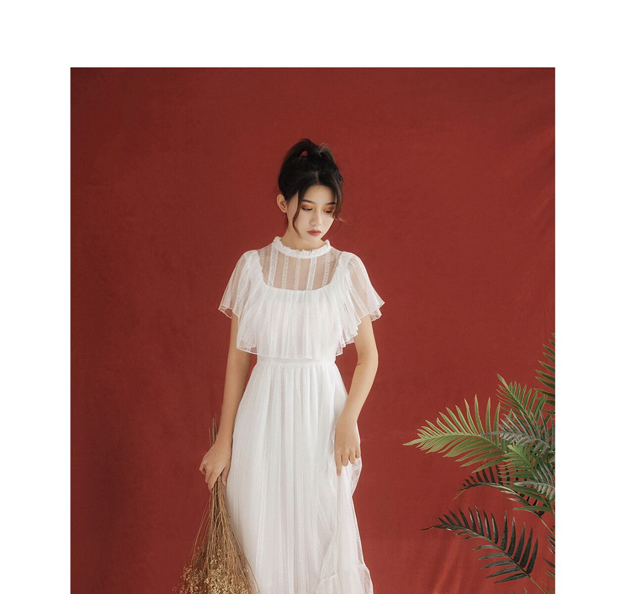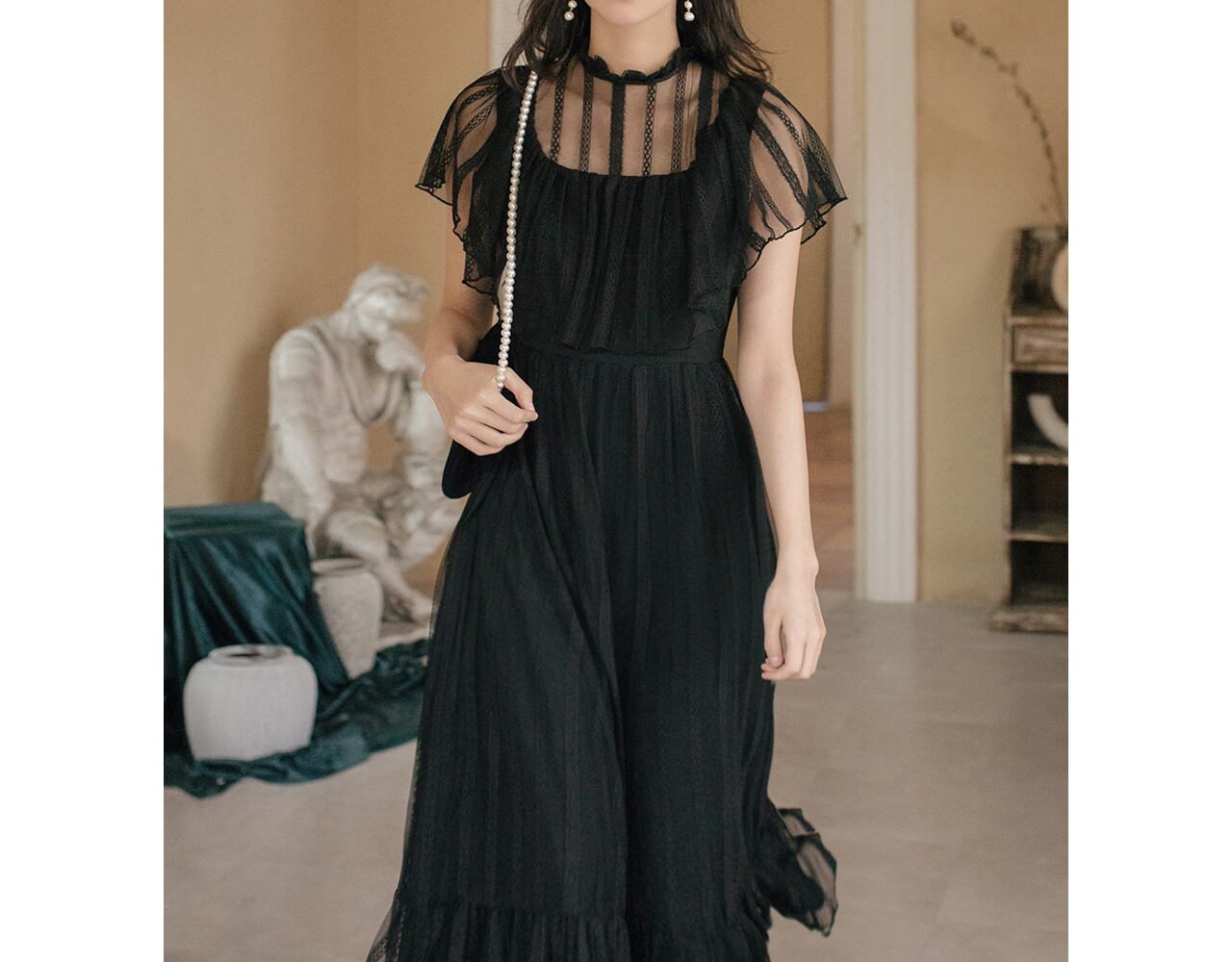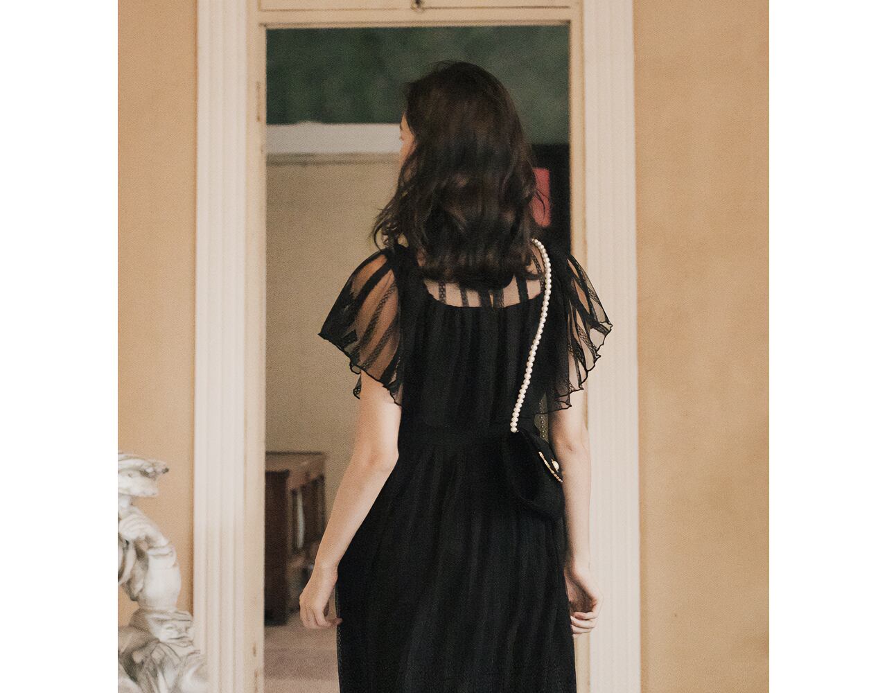 透け感あるデコルテとフリル袖が可愛らしいパーティードレス。