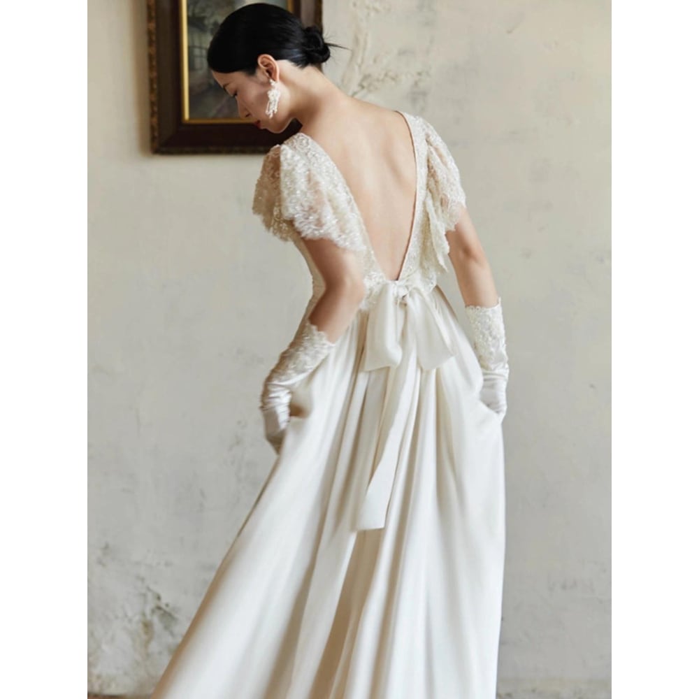 レーシィなお袖とバックリボンが可愛らしいウェディングドレス。