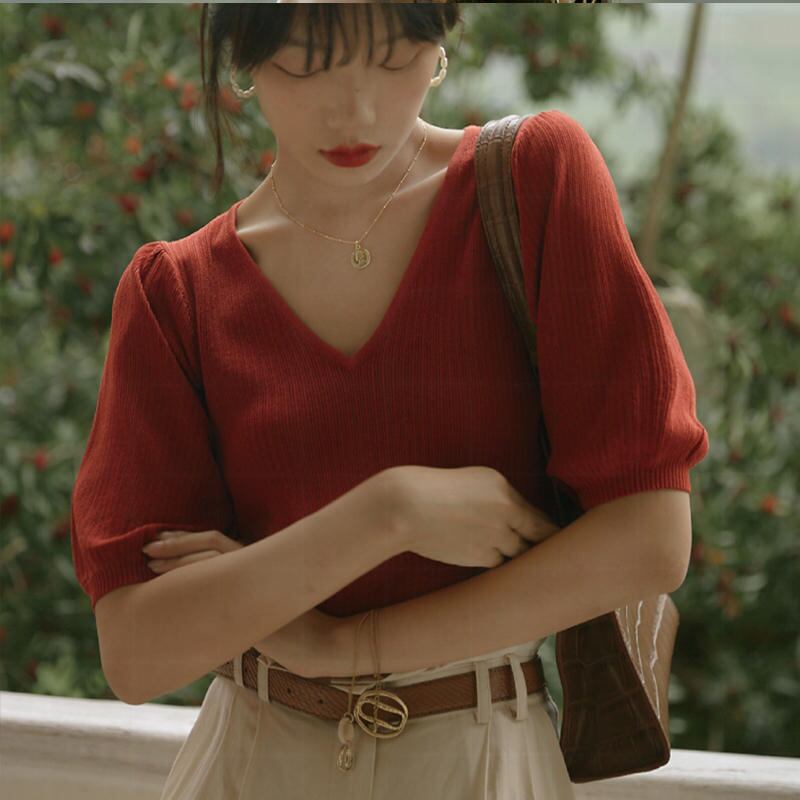 【ニット】ニット セーター レディース おしゃれ かわいい vネック トップス 半袖 20代 30代 40代 春 夏 秋 レディース ニット パープル 紫 ベージュ レッド 赤 S M L XL