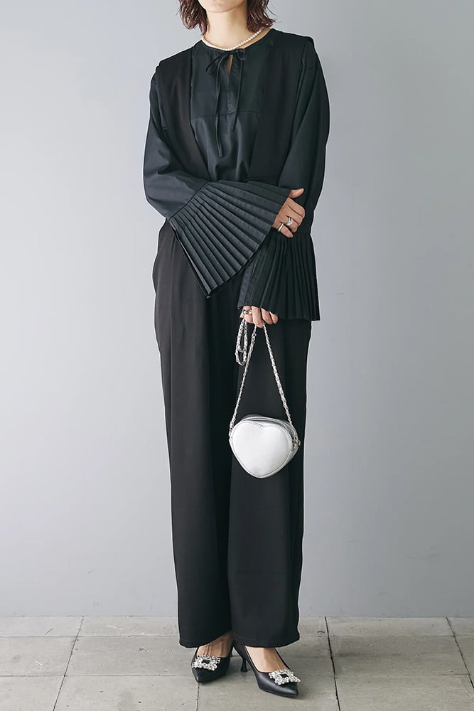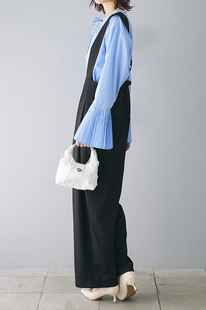 tシャツだけでなくフリルの効いたブラウスなどあわせるトップスで表情を変えるアイテム◎