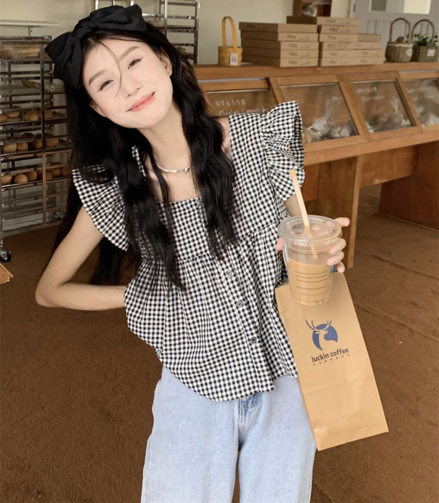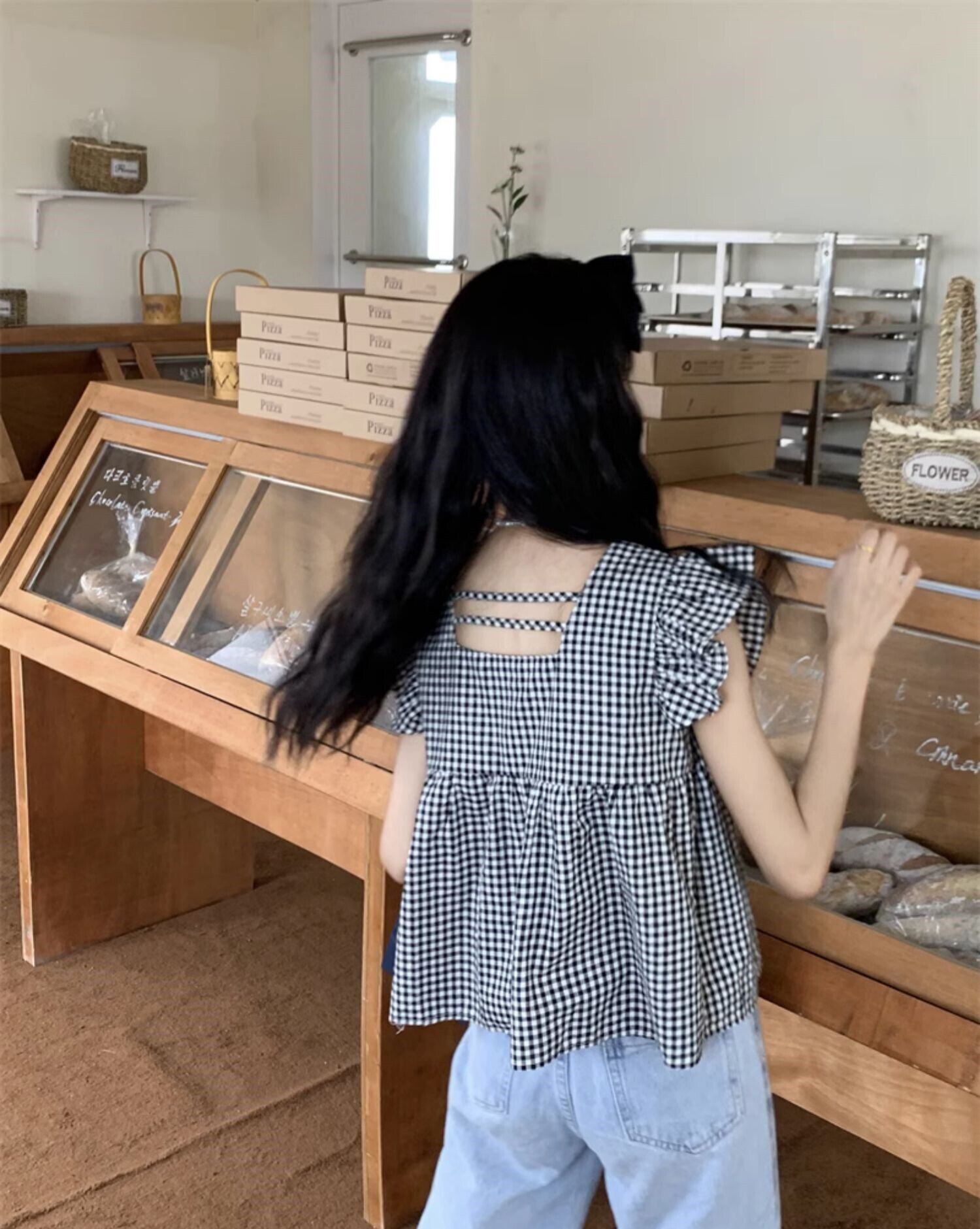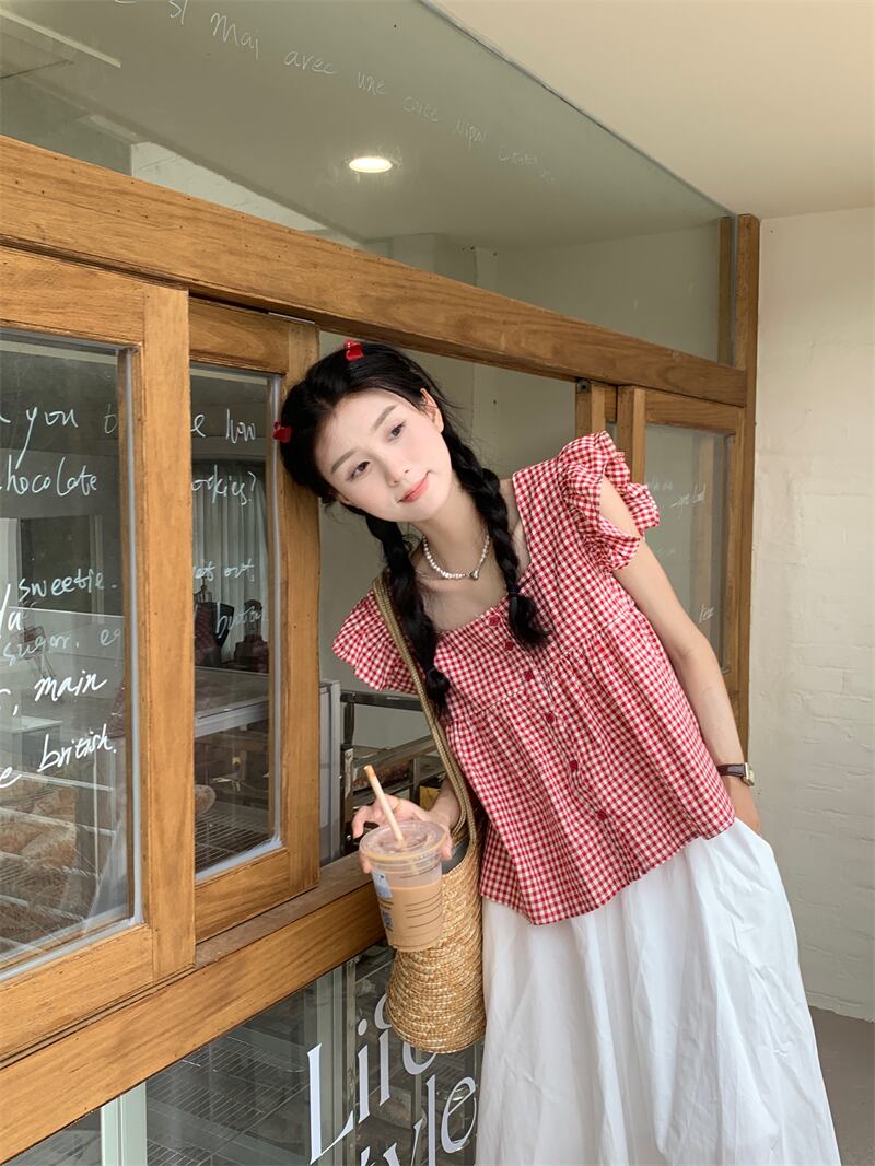 肩口のフリルが可愛らしいギンガムチェックのブラウス。