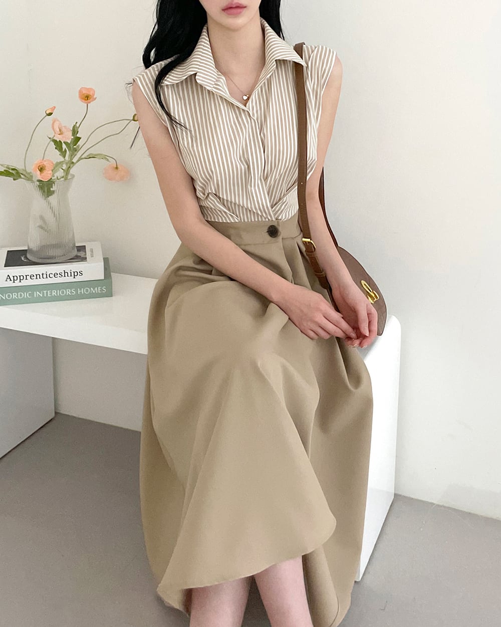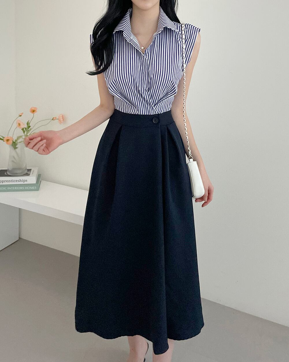 一点で上品なお嬢さん風ルックが叶う!ストライプ柄のドッキングシャツワンピース。