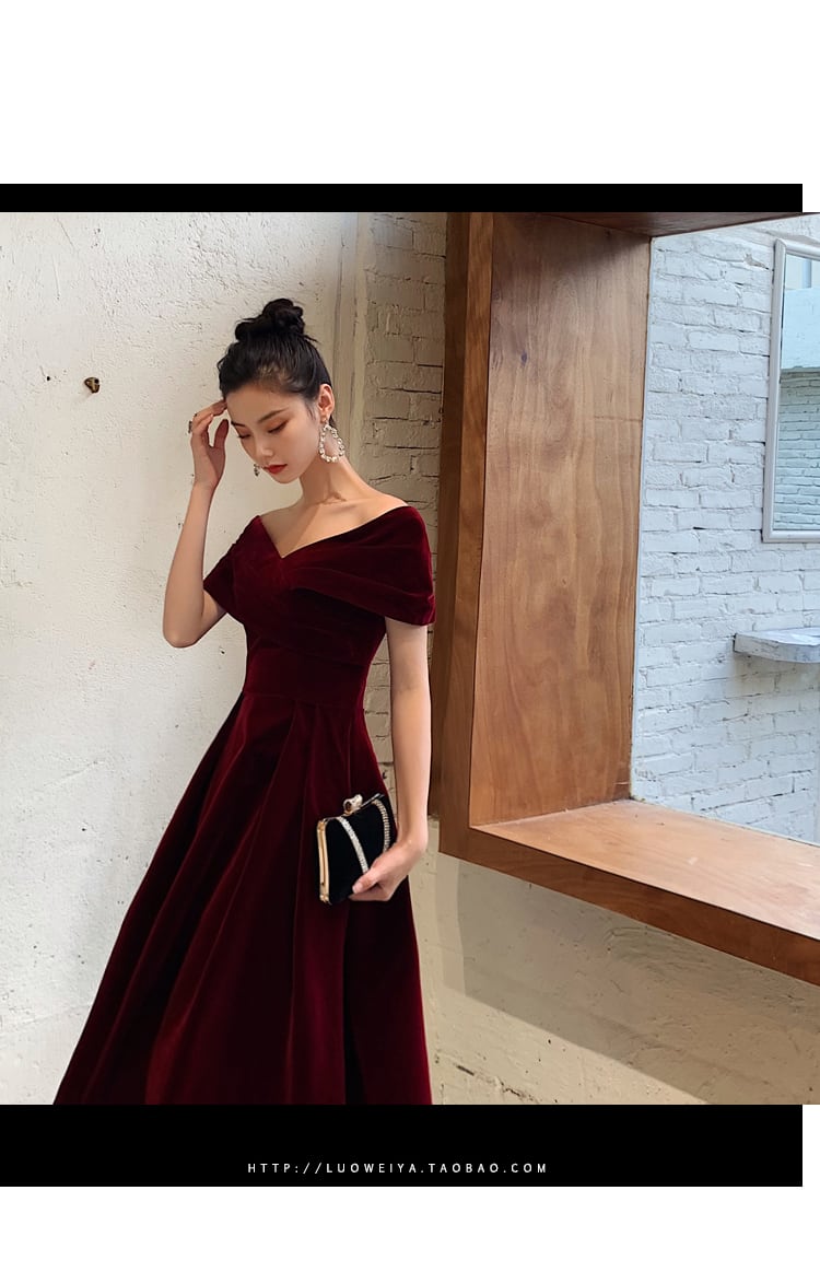 大人エレガントな深いバーガンディーカラーのスエードオフショルドレス。