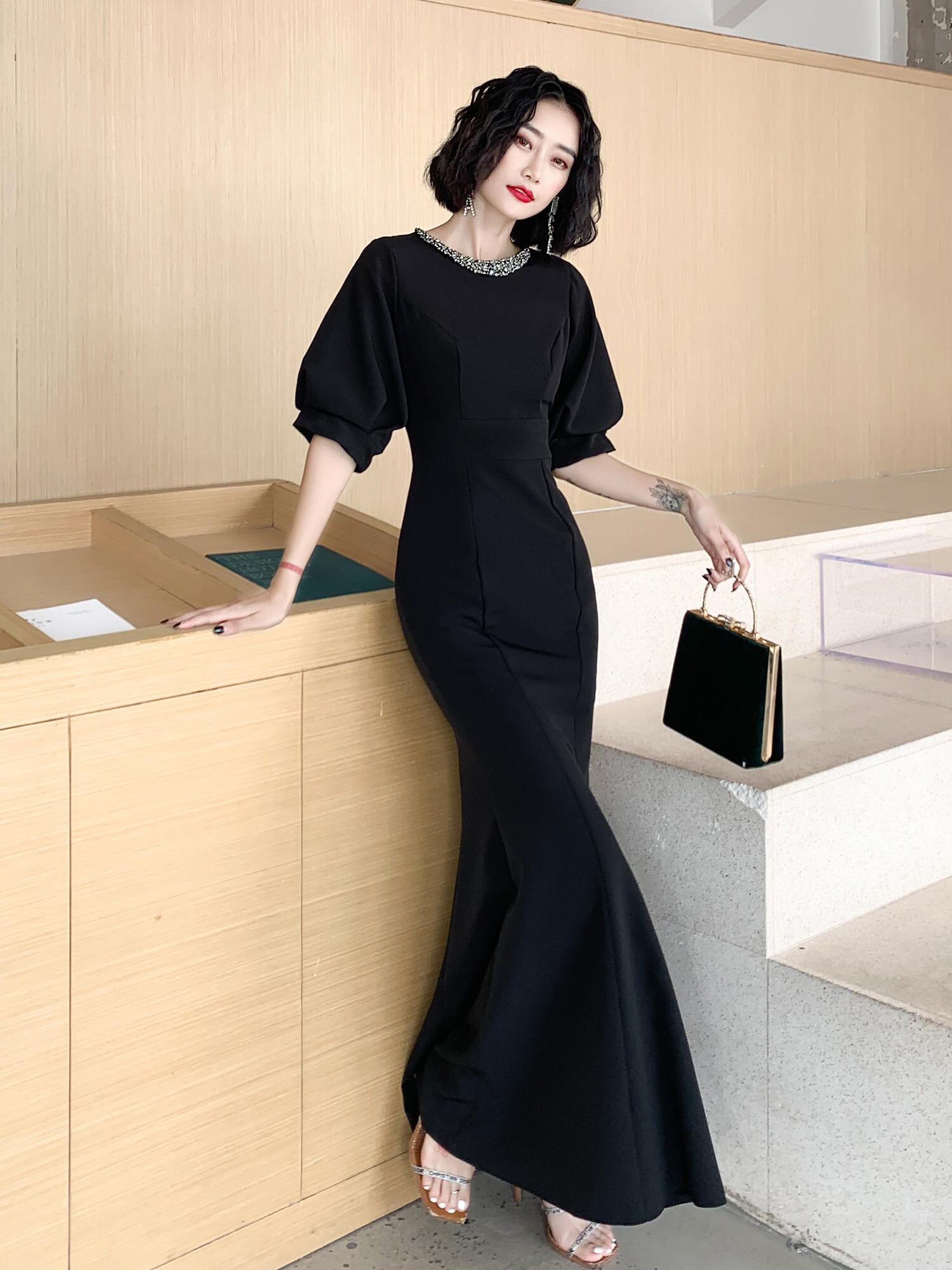 お首まわりのビジューがエレガントなマーメイドラインのパーティードレス。
