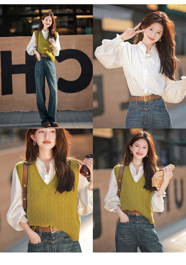 首まわりやお袖のさりげないフリルが女性らしさをプラス。