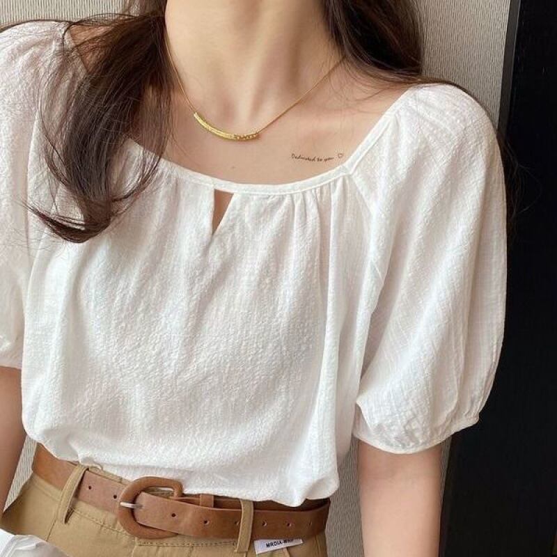 スクエアネックの襟元が女性らしいシンプルなカットソー。