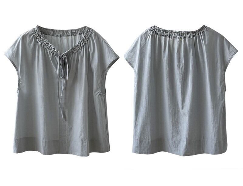 胸元のリボンとギャザーが可愛らしいブラウス。