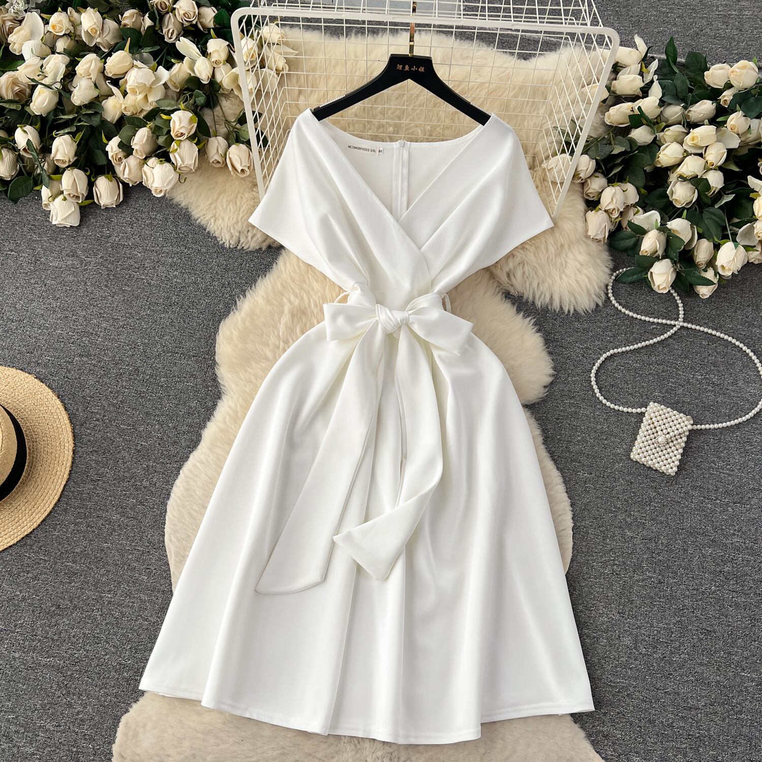 ウエストリボンがエレガントなvネックワンピースドレス。