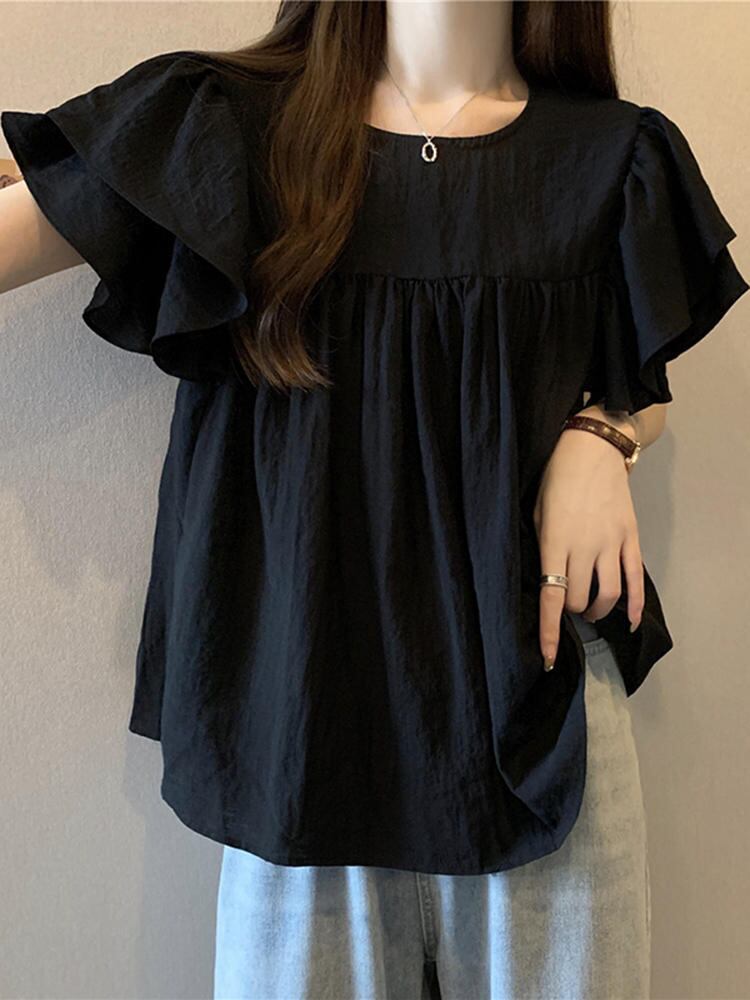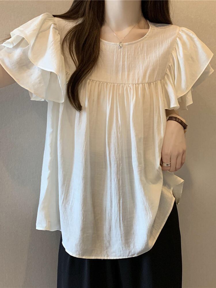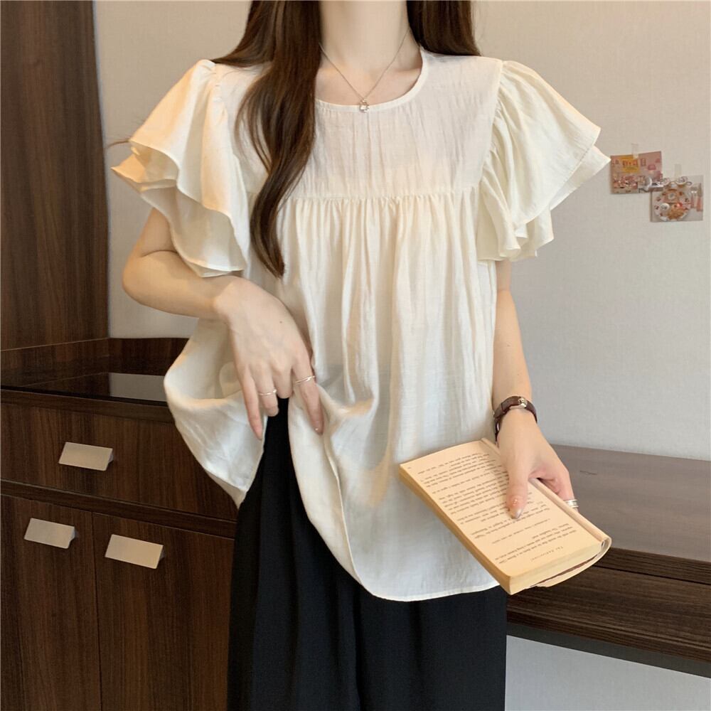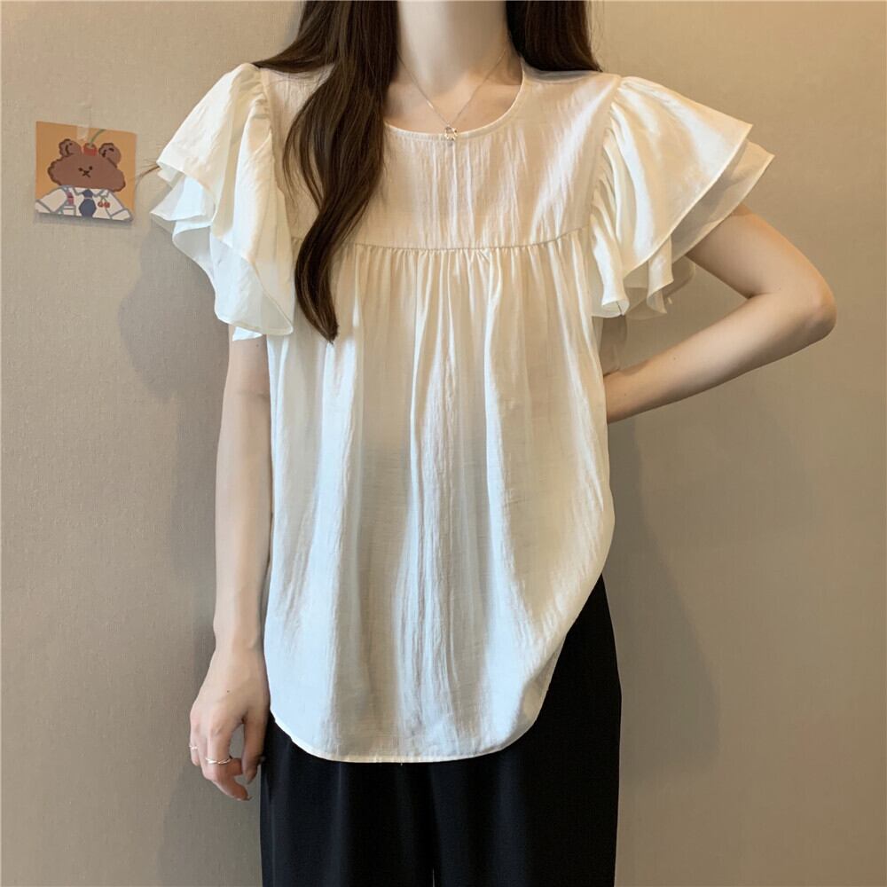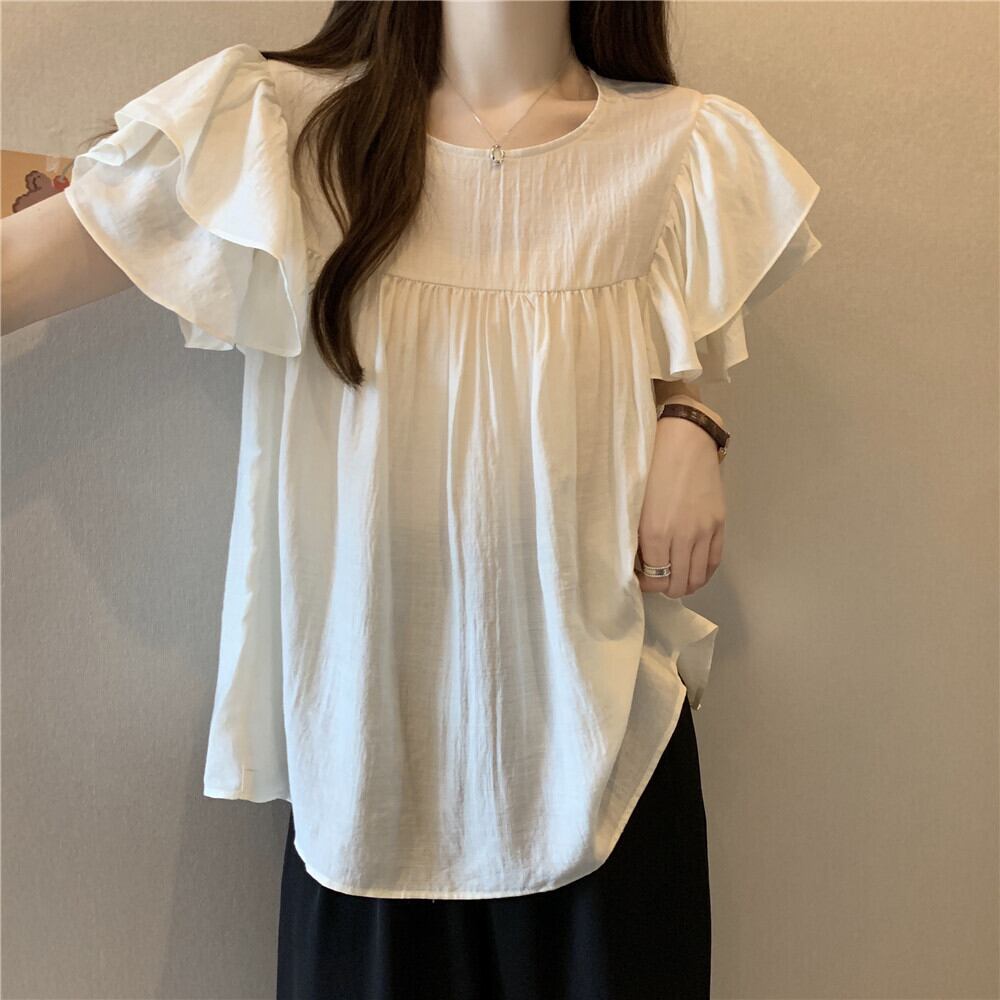 肩口のフリルが大人可愛いシフォンブラウス。